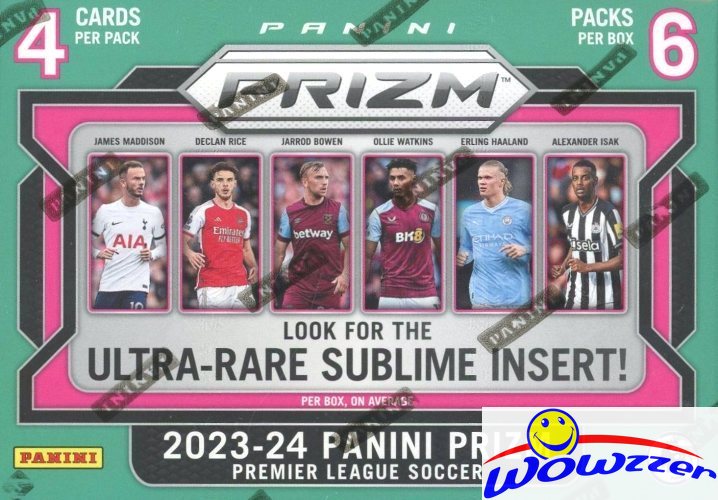 Wowzzer! We are Proud to offer this 2023/24 Panini Prizm Premier League Soccer EXCLUSIVE Factory Sealed Blaster Box! This Exclusive Factory Sealed Box Includes 6 Packs and 4 Cards per Pack Including 18 Blaster-Exclusive PINK Mosaic Prizms, Two Base Orange Mosaic Prizms, One Purple Mosaic Prizm or Silver Prizm, and Two Inserts! The international juggernaut that is Prizm Premier League returns for the 2023/24 season with a vibrant array of Prizm parallels, including the hobby blaster-exclusive Blue Mosaic Prizms. Now, as always, Prizm is packed with a spectular insert lineup that includes the aforementioned staples as well as Fireworks, Emergent, Talismen, Prizm Flashback 2012 and more.