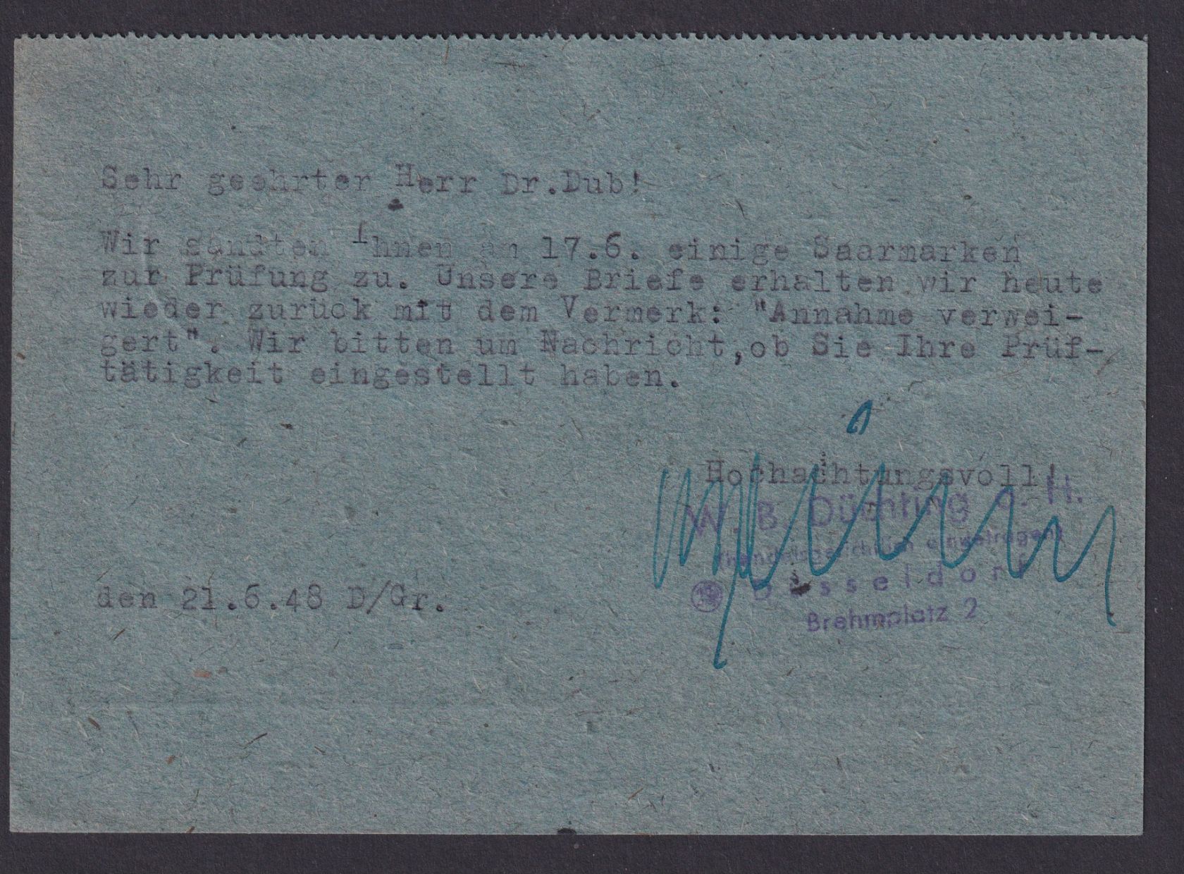Zehnfachfrankatur All. Besetzung Karte Düsseldorf Philatelie Düchting n. IdarArtikelnummer: 723050215 Oberstein teils vom Rand 23.06.1948 Unsere Ebay - Freunde, die keine Neuigkeiten mehr verpassen möchten, folgen uns doch bitte einfach auf ebay. Wie das geht? Einfach auf den blauen Button - rechts - "Diesem Verkäufer speichern" klicken. We invite you to follow us on ebay so that you never miss our best offers. Nahues Online Auktionen Philatelie Briefmarken Postgeschichte Münzen Geldscheine Ansichtskarten Deutschland Europa Übersee BITTE BEACHTEN SIE: EVENTUELLE ZUSÄTZLICHE BILDER ZU UNSEREN ANGEBOTEN FINDEN SIE UNTER DIESEM TEXT! Die Ermittlung der Umsatzsteuer erfolgt nach den Vorschriften zur Differenzbesteuerung (§ 25a UStG bei Sammlerstücken und Antiquitäten/Sonderregelung) und wird deshalb nicht ausgewiesen!