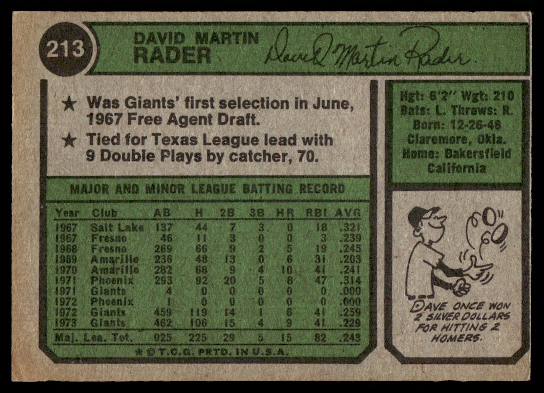 | 1974 Topps **C** Dave Rader San Francisco Giants #213 |