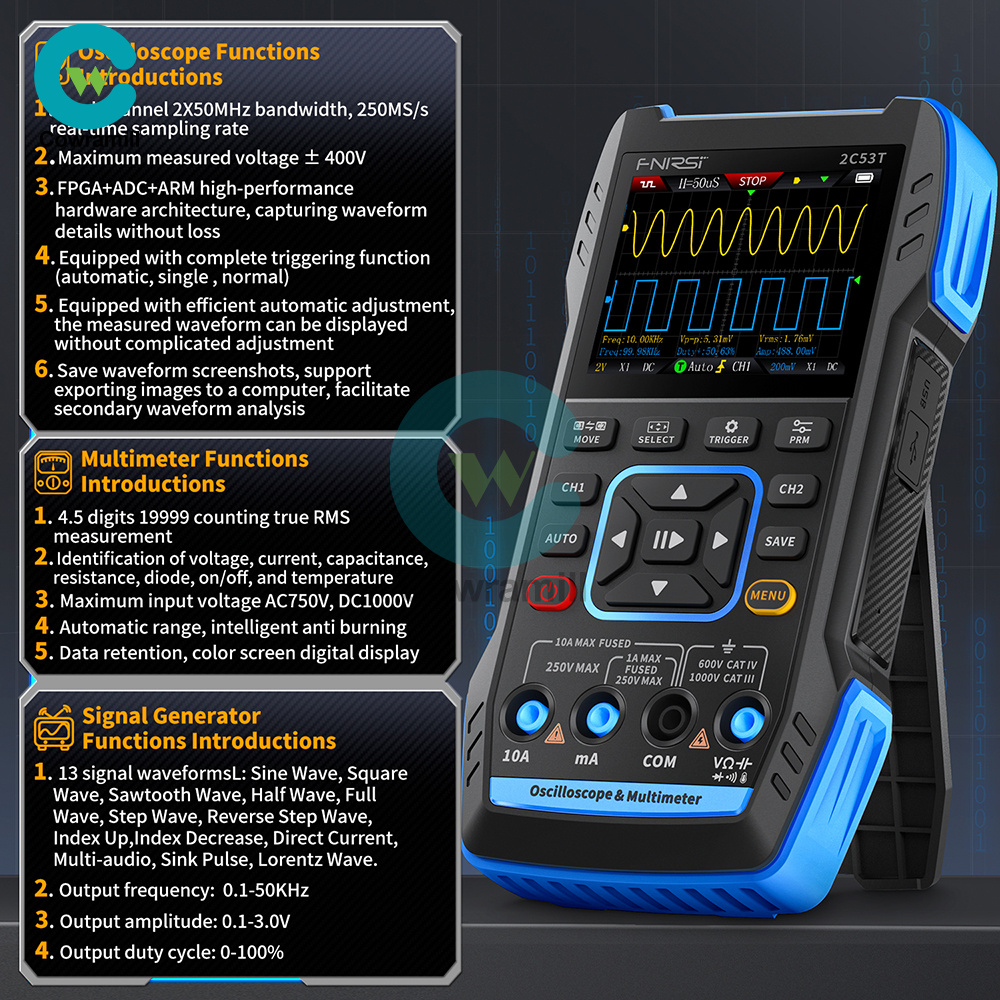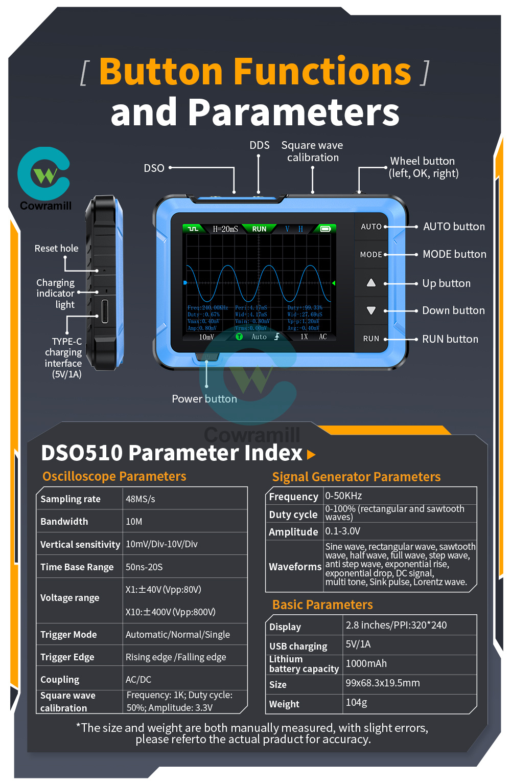 1. 2-in-1 function: the product built-in oscilloscope and signal generator function, the product is compact and cost-effective.