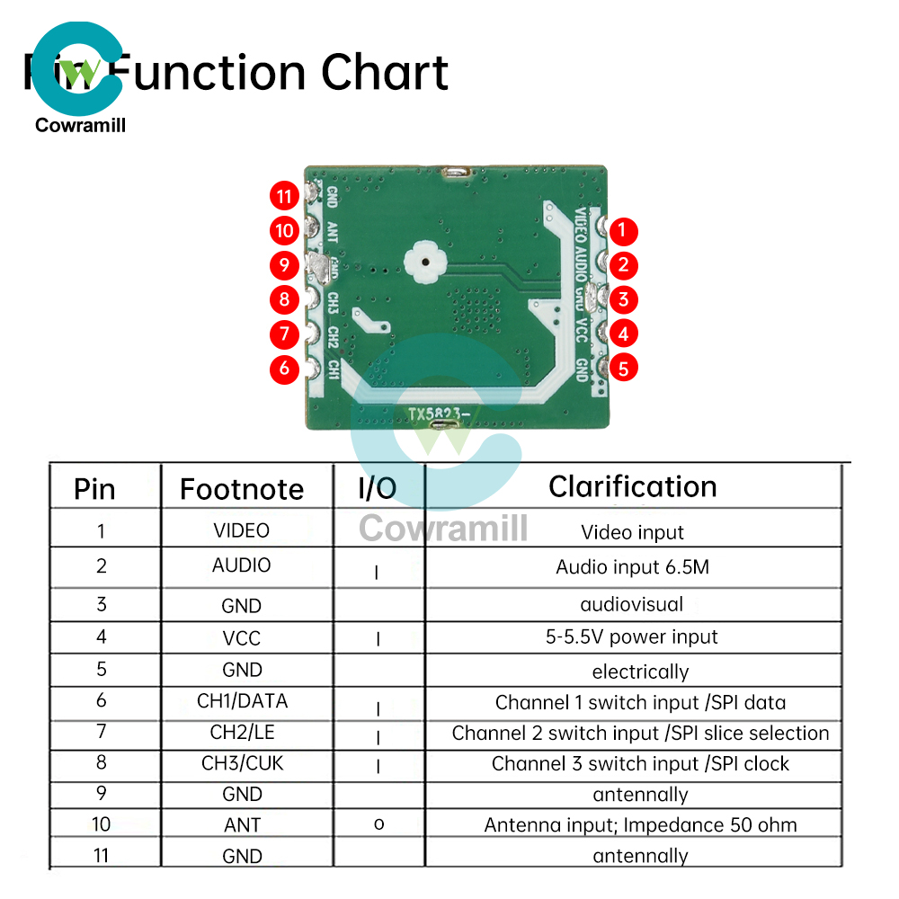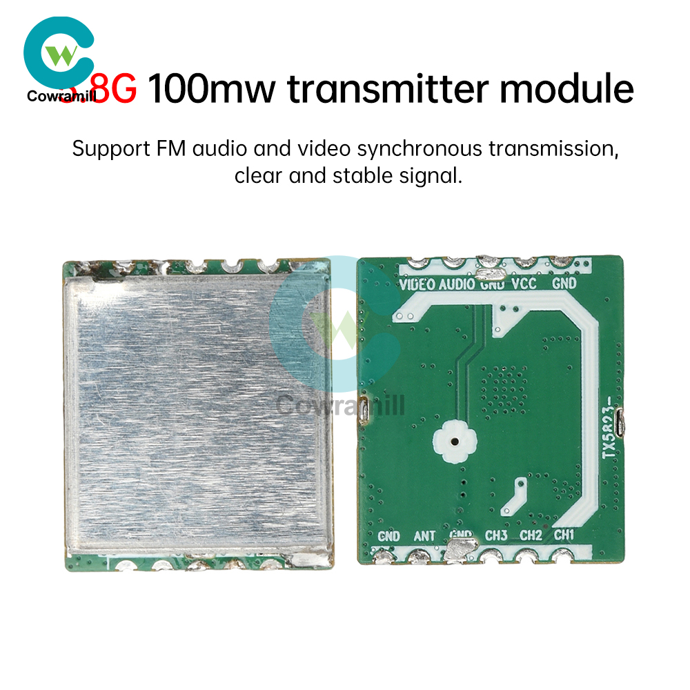 This transmitter module is an FM audio and video transmitter module working in the 5645-5945MHz ISM band (or use SPI mode to control the band through an external microcontroller). Module using a single chip design, the chip integrated VCO, PLL, broadband FM video modulation, FM accompanied by voice modulation, so that the module has a small size, low power consumption, high sensitivity and other characteristics; module to take the form of SMD package, occupies a very small machine space; the application of this module only need to simply connect the power supply, audio cable, video cable, connect the antenna can be transmitting sound, image signals.