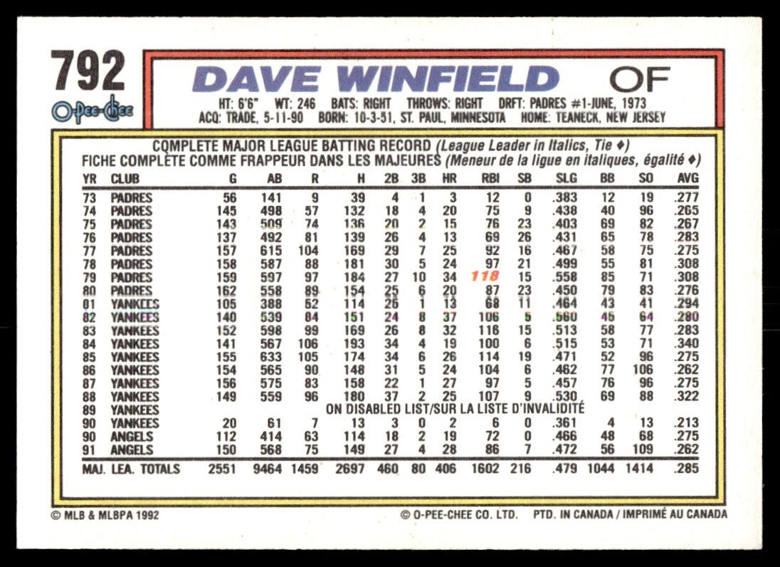 | 1992 O-Pee-Chee Dave Winfield Toronto Blue Jays #792 |