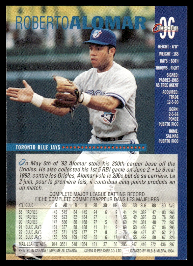 | 1994 O-Pee-Chee Roberto Alomar Toronto Blue Jays #96 |