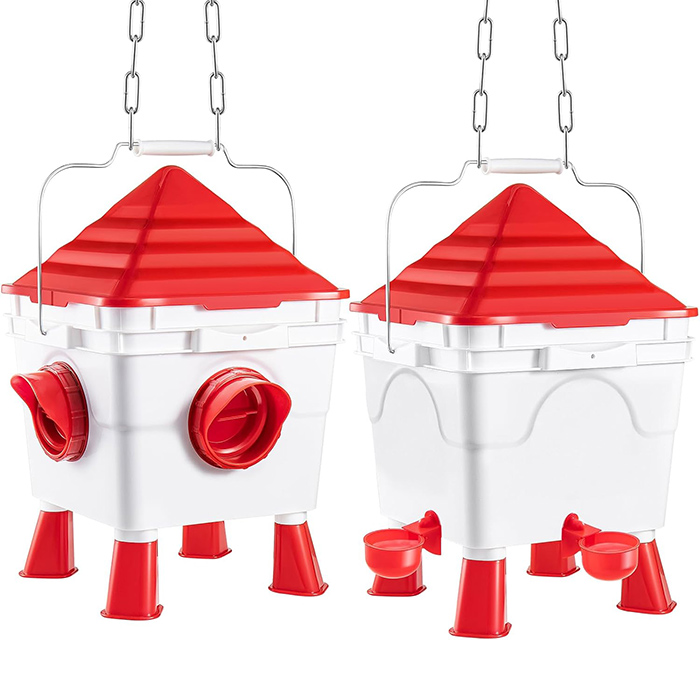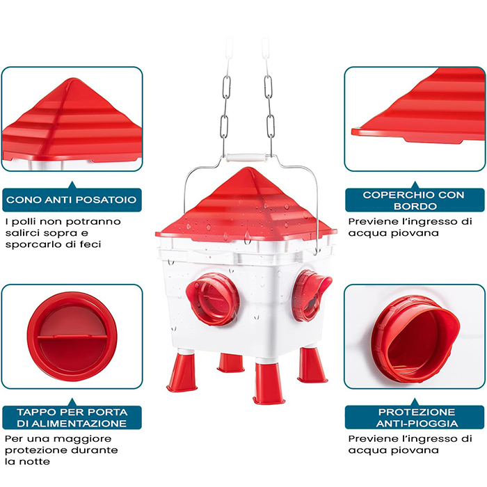 - 🐔 Igienica e sicura – Il coperchio conico impedisce ai polli di salire sopra la mangiatoia, evitando contaminazioni da feci. Il design chiudibile con tappi protegge il cibo durante la notte da roditori e animali indesiderati.
