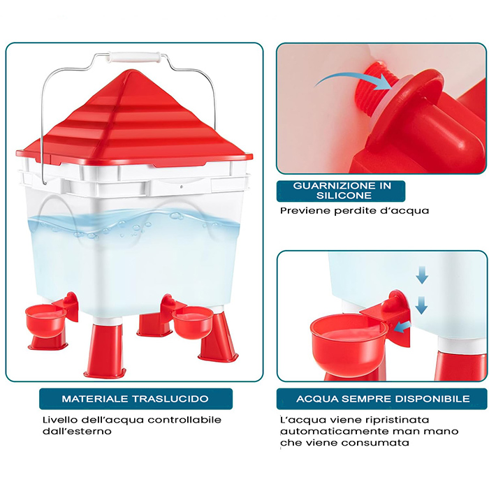 - 🐔 Abbeveratoio automatico incluso – L’abbeveratoio si riempie automaticamente con acqua pulita, senza che i polli debbano beccare. Capacità da 8,5 Lt per una gestione semplice e autonoma dell’idratazione del pollame.
