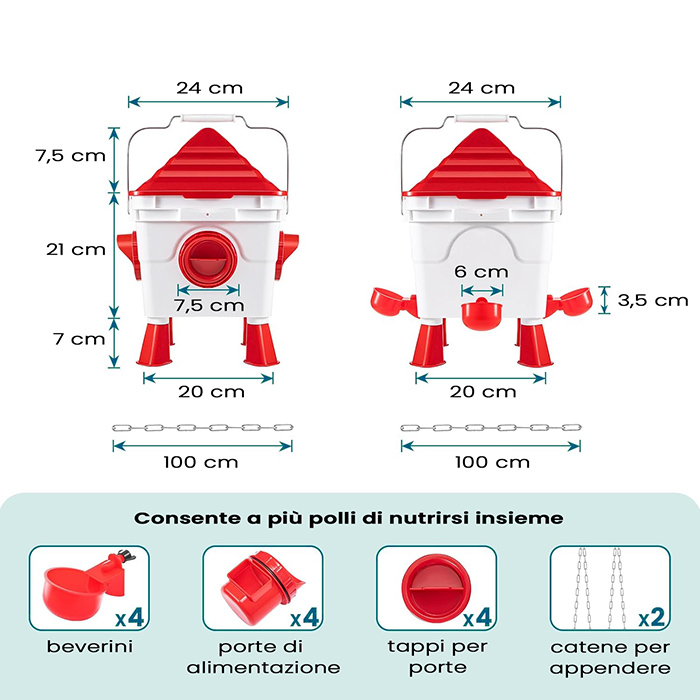- 🐔 Installazione rapida senza attrezzi – Il kit include mangiatoia da 6 Kg con 4 porte e abbeveratoio automatico da 8,5 Lt. Si monta in pochi secondi grazie ai piedini ad innesto o può essere sospeso con la catenella inclusa: perfetto per qualsiasi tipo di pollaio.