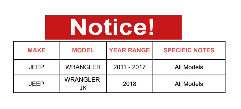 | JEEP | WRANGLER | 2011 - 2017 | All Models |