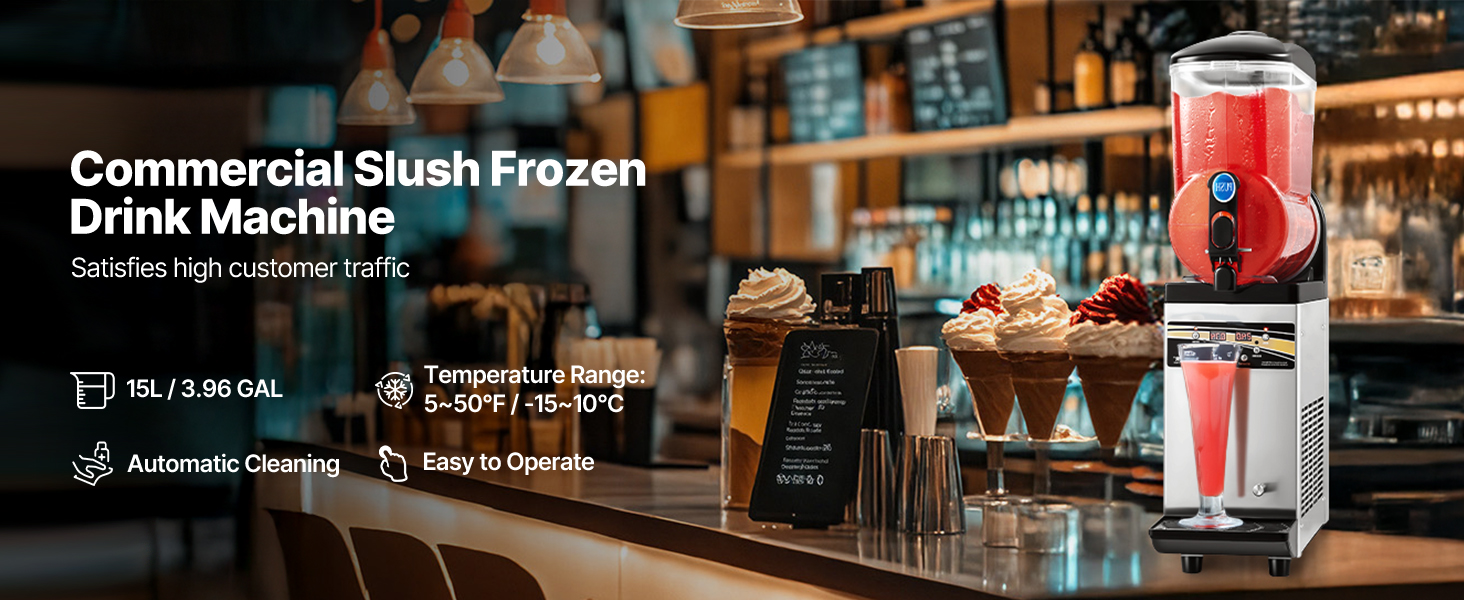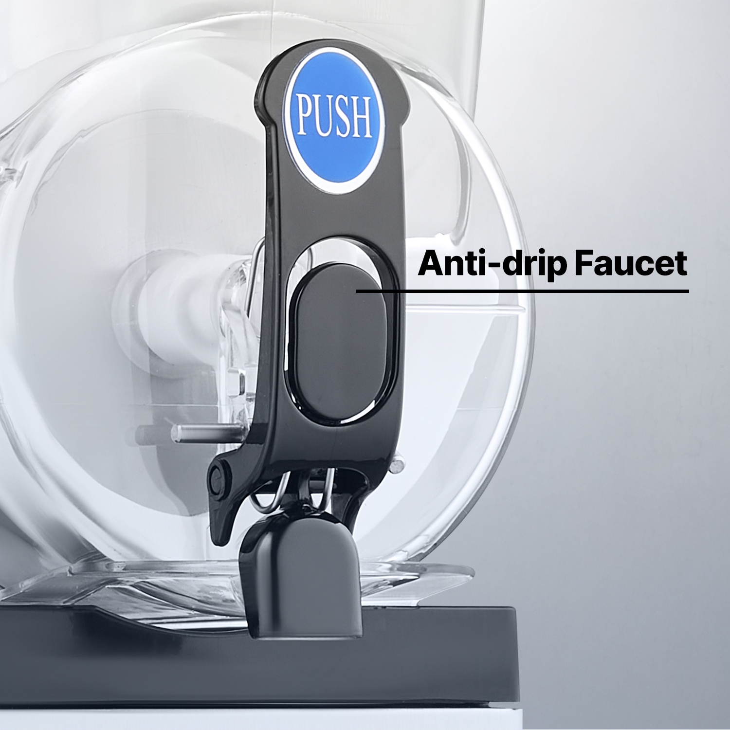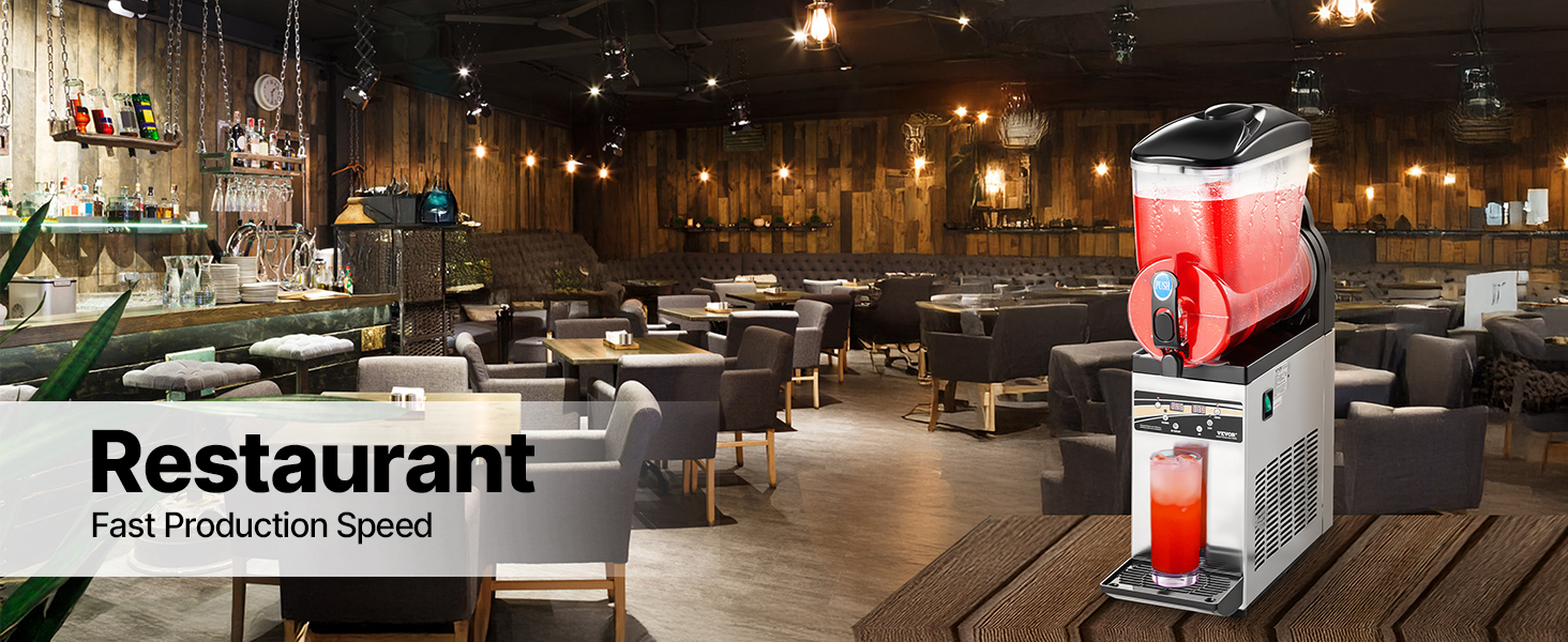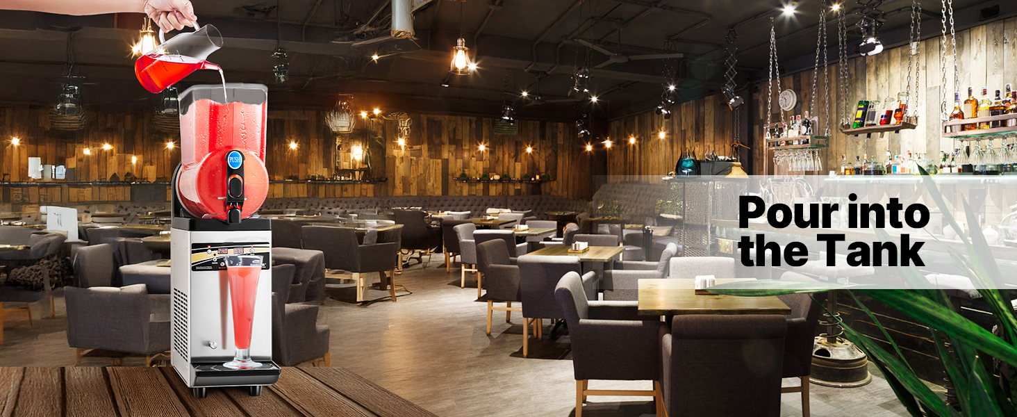 - Serbatoio singolo da 15 litri: il serbatoio trasparente presenta bevande colorate ed è quindi ideale per gelaterie, ristoranti di hamburger, caffè, bar e altri esercizi commerciali.