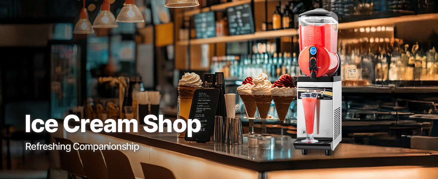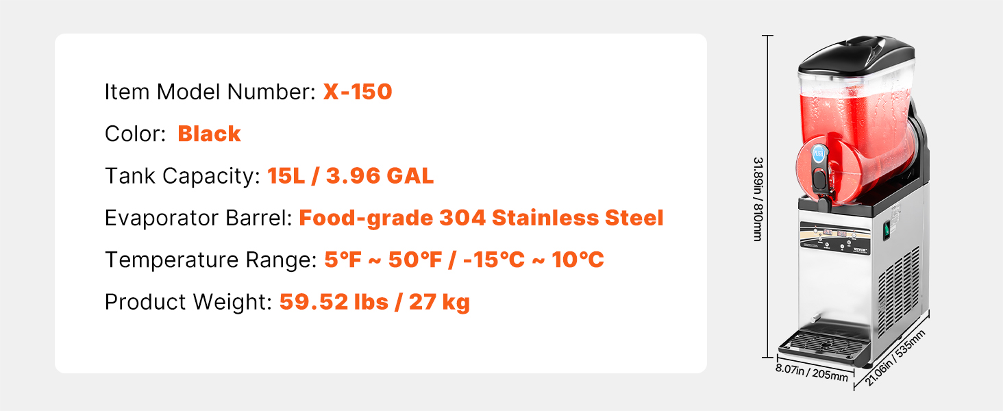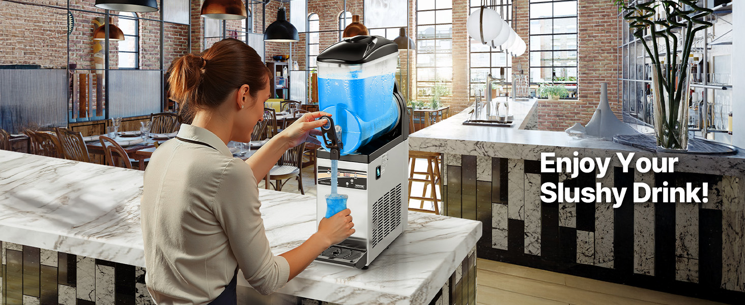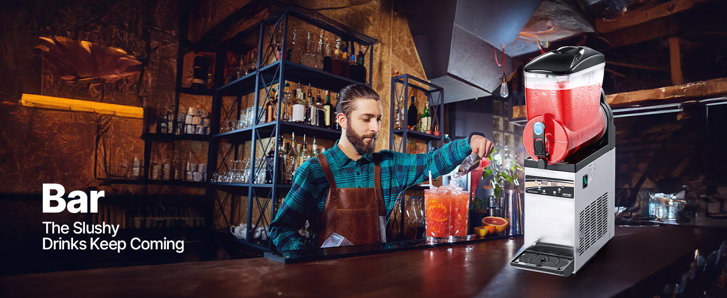 - Serbatoio singolo da 15 litri: il serbatoio trasparente presenta bevande colorate ed è quindi ideale per gelaterie, ristoranti di hamburger, caffè, bar e altri esercizi commerciali.