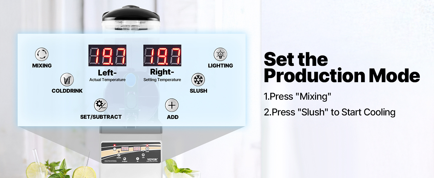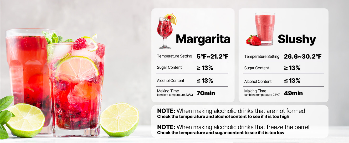 - Per varie bevande: questa macchina per frullati commerciale migliorata ha un intervallo di temperatura regolabile da 5 a 50 ℉ (da -15 a 10 °C), per le bevande fredde: da 37,4 a 41 ℉ (da 3 a 5 °C); per bevande analcoliche granite: da 26,6 a 30,2 ℉ (da -3 a -1 °C); per le bevande alcoliche: da 5 a 21,2 ℉ (da -15 a -6 °C). Contenuto di zucchero consigliato: circa 13%, contenuto di alcol: inferiore al 13%