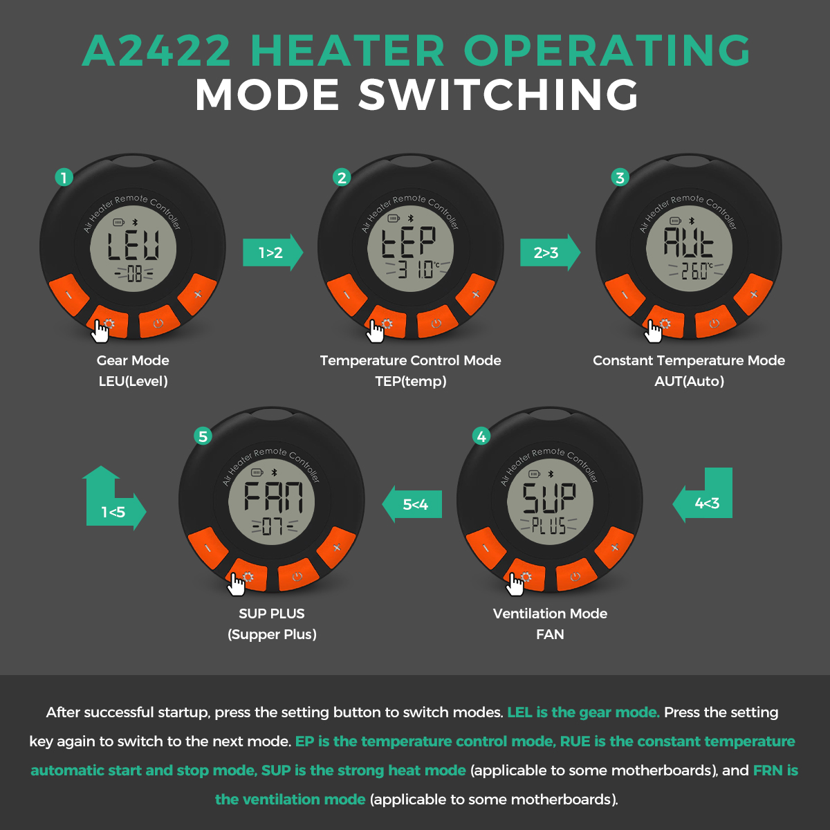 Bluetooth-Funktion: Um Ihnen Zeit zu sparen und die Nutzung unseres Heizgeräts für Sie komfortabler zu gestalten, haben wir die Hauptplatine des Heizgeräts aktualisiert und insbesondere ein erweitertes Bluetooth-Modul hinzugefügt. Mit der App können Sie das Heizgerät bedienen. Die Bluetooth-App für das Dieselheizgerät verfügt über drei Betriebsmodi: Automatikmodus, manueller Modus und manueller Nachfüllmodus. Verschiedene Modi erfüllen Ihre unterschiedlichen Anforderungen.