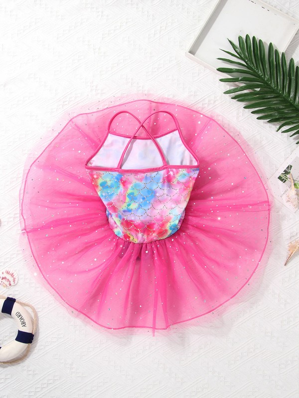 Spaghetti shoulder straps, bling-bling mermaid top bodice printed with fish scales pattern.