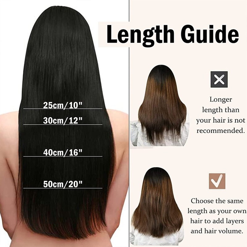 【Real Hair Extension Weight】this hair extensions clip in real hair weight is 12“-70g,14"-75g, 16’’-95g, 18"-95g, 20’’-110g. 1 piece is for adding length, 2 piece for adding volume. It’s not suitable for people with very fine hair on the top or baldness as the wire may not be well hidden.