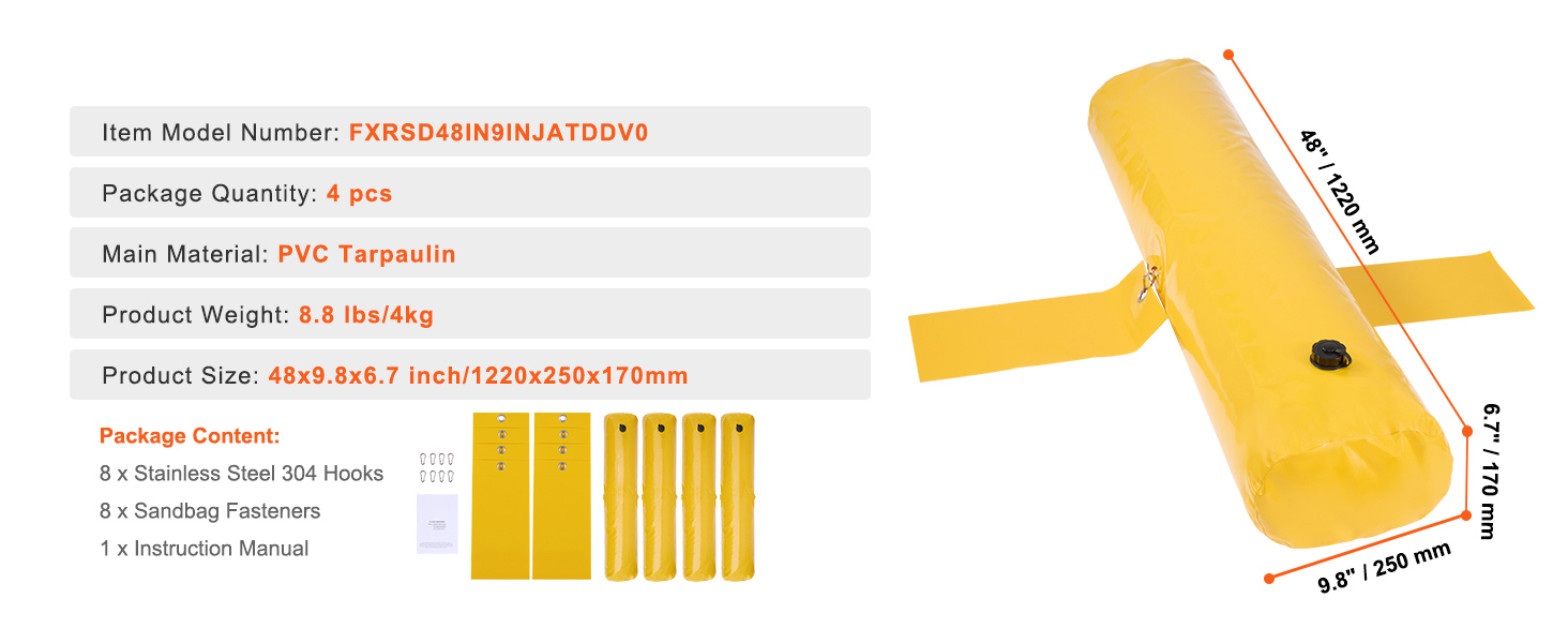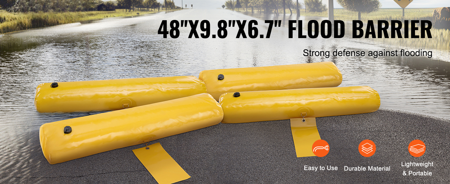 Effektive Hochwasserbarriere: Dieses Set enthält 4 Stück Hochwasserschutzbeutel mit den Maßen 48 x 9,8 x 6,7 Zoll (1220 x 250 x 170 mm), die jeweils 0,47 m³ Wasser aufnehmen können. Im gefüllten Zustand bilden sie eine robuste, hochbelastbare Barriere, die Hochwasser effektiv blockiert, trennt und kontrolliert, um Häuser, Garagen und Keller zu schützen.