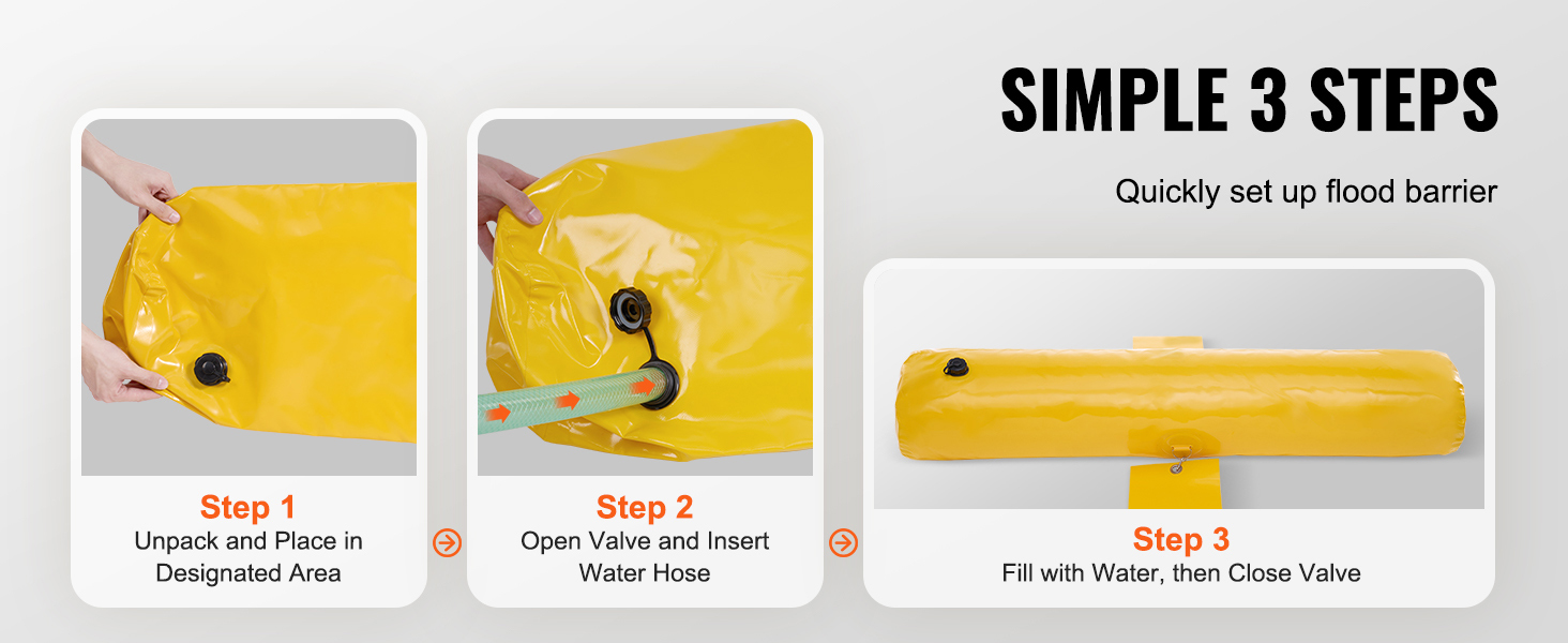 Einfach zu bedienen: Füllen Sie die Wasserbarrieren bei Überschwemmungen einfach, indem Sie das Ventil öffnen, einen Schlauch einführen, mit Wasser füllen und dann das Ventil für den sofortigen Gebrauch schließen. Die Bedienung ist einfach und bequem.