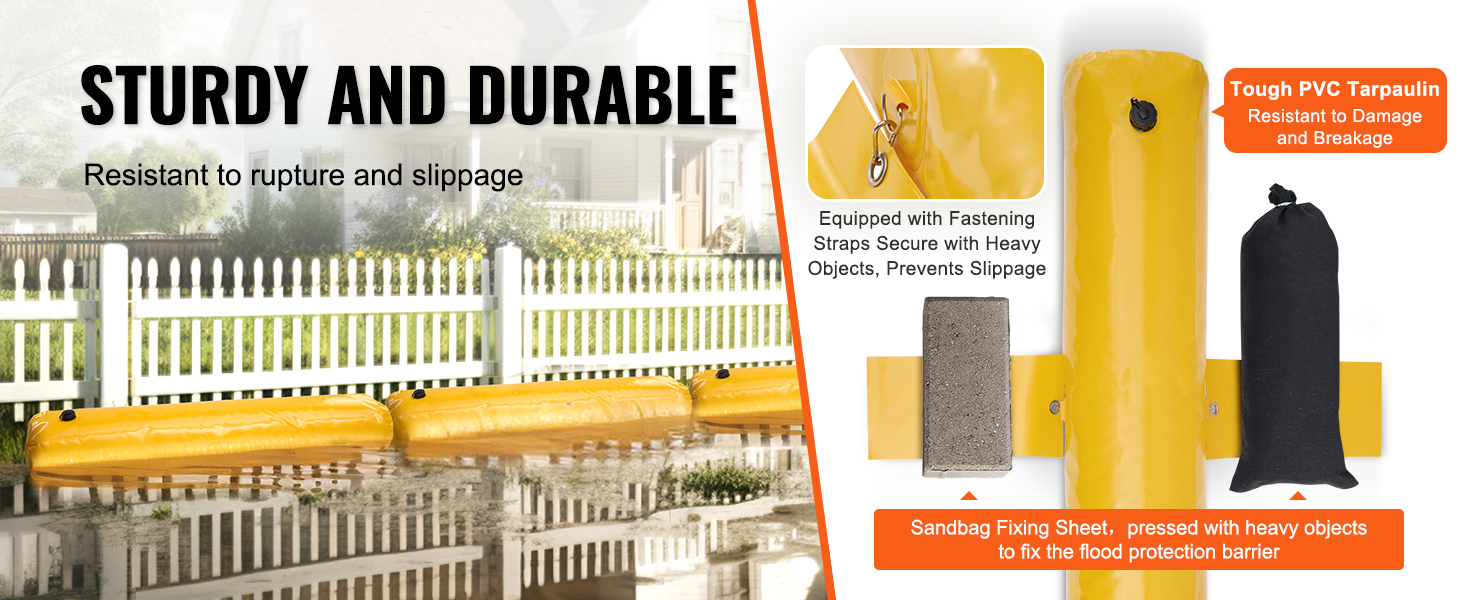 Langlebige Konstruktion: Die aus hochfester PVC-Plane gefertigten Hochwasserbarrieren sind robust und langlebig. Selbst wenn sie mit Wasser gefüllt sind, sind sie reißfest. Ausgestattet mit Befestigungsklammern können sie mit schweren Gegenständen an Ort und Stelle befestigt werden, um ein Verrutschen zu verhindern, und bieten so einen starken Schutz gegen Überschwemmungen.