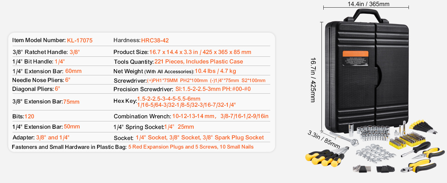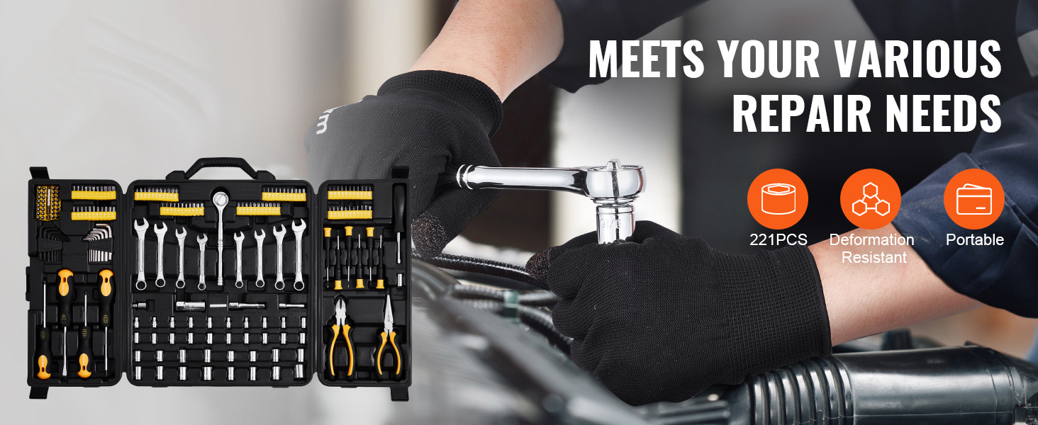 Ultimative Kompatibilität: Dieses 221-teilige Mechaniker-Werkzeugset umfasst SAE- und metrische Größen von 3/8 und 1/4 Zoll Antriebsnüsse, Ratschengriffe, Inbusschlüssel, Verlängerungen, Bits, Schraubendreher und Zangen und ist somit perfekt für die Durchführung komplexer Reparaturarbeiten geeignet.