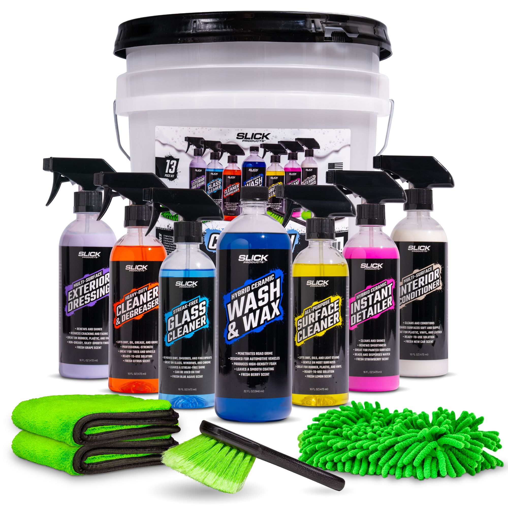 Unlock the full potential of your vehicle's appearance with the Slick Products Car Wash & Detail Kit. Designed to make your next cleaning session faster, safer, and easier, this comprehensive 13-piece set is the ultimate solution for maintaining a showroom-worthy shine on your car, truck, motorcycle, RV, or any other automotive vehicle.