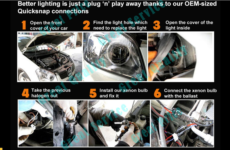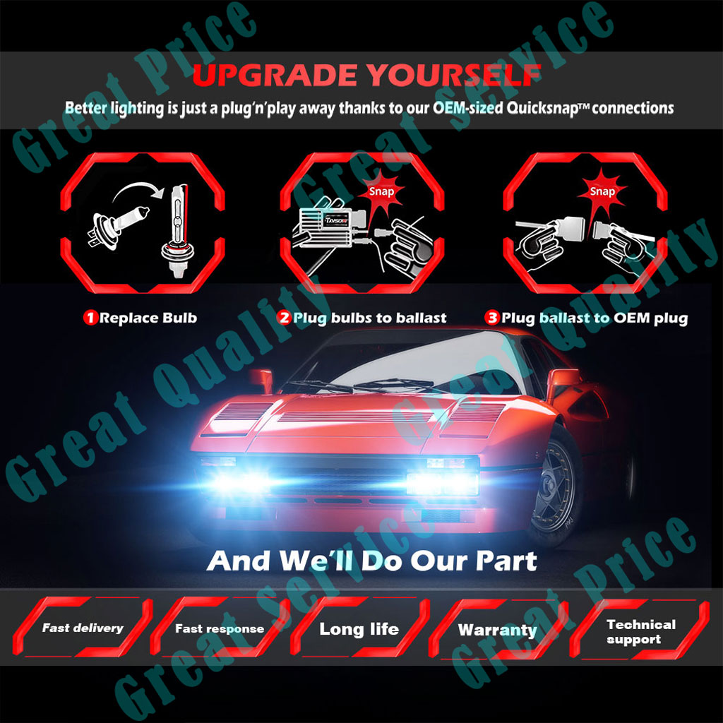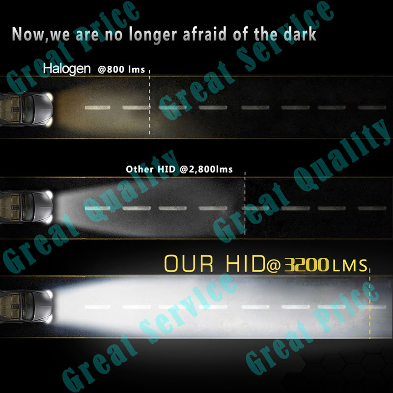 HID Bulbs: Available bulb Single Beam: H1, H7, (High or Low beam depends on what your car model is, No high beam and Low beam at the same time.) Available bulb Dual Beam: H4/9003 (Hi/Lo Beam) Power: 55W Luminouns flux: 3200lm Input voltage: DC 9-32V (fit for universal) Input current: 6A MAX Working Current: 4.2A Working Noise: ≤5DBA Temperature range:-40 degree to +105 degree Warranty: 5 Year warranty Compatibility: Car, motorcycle, electric motor car