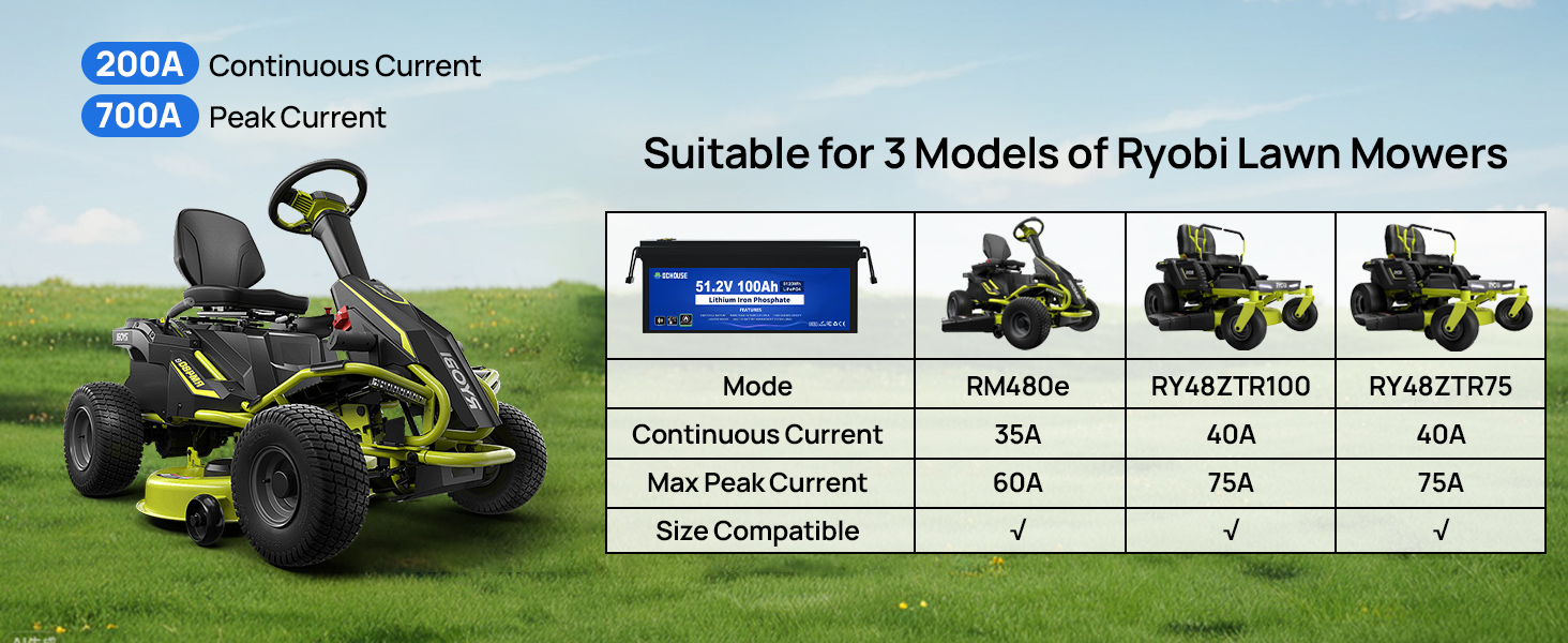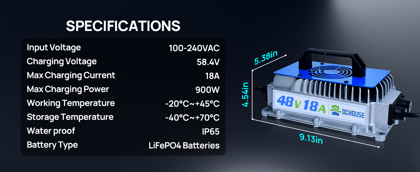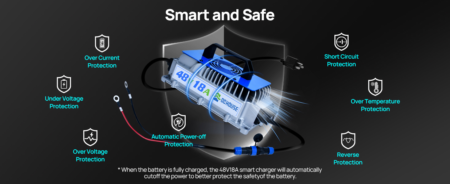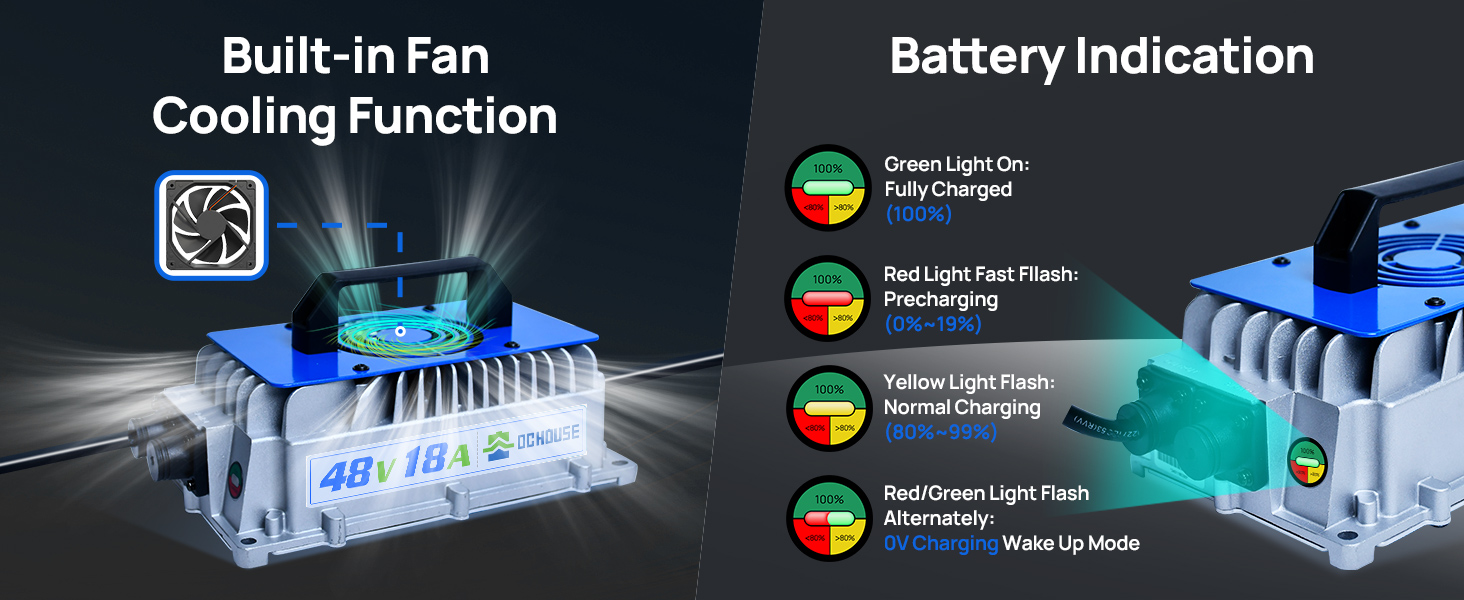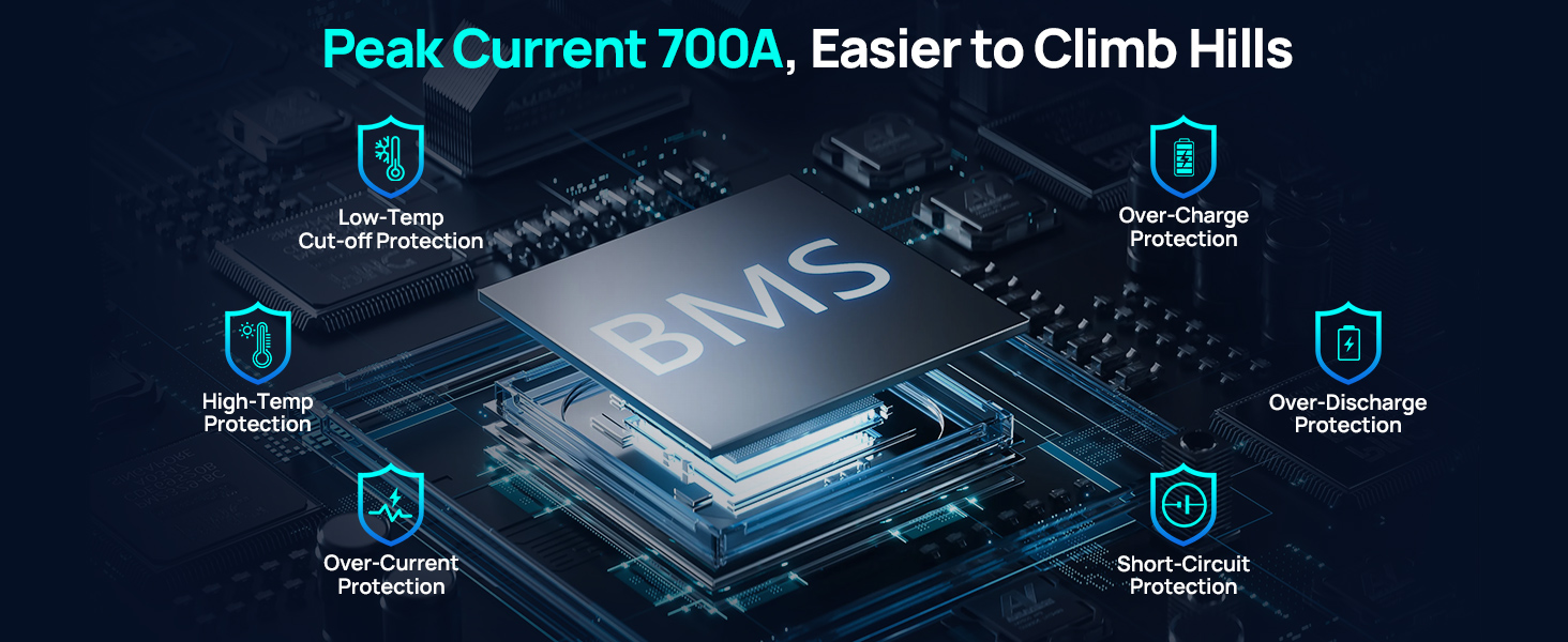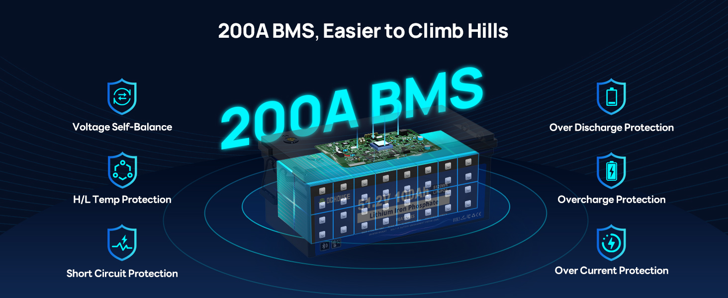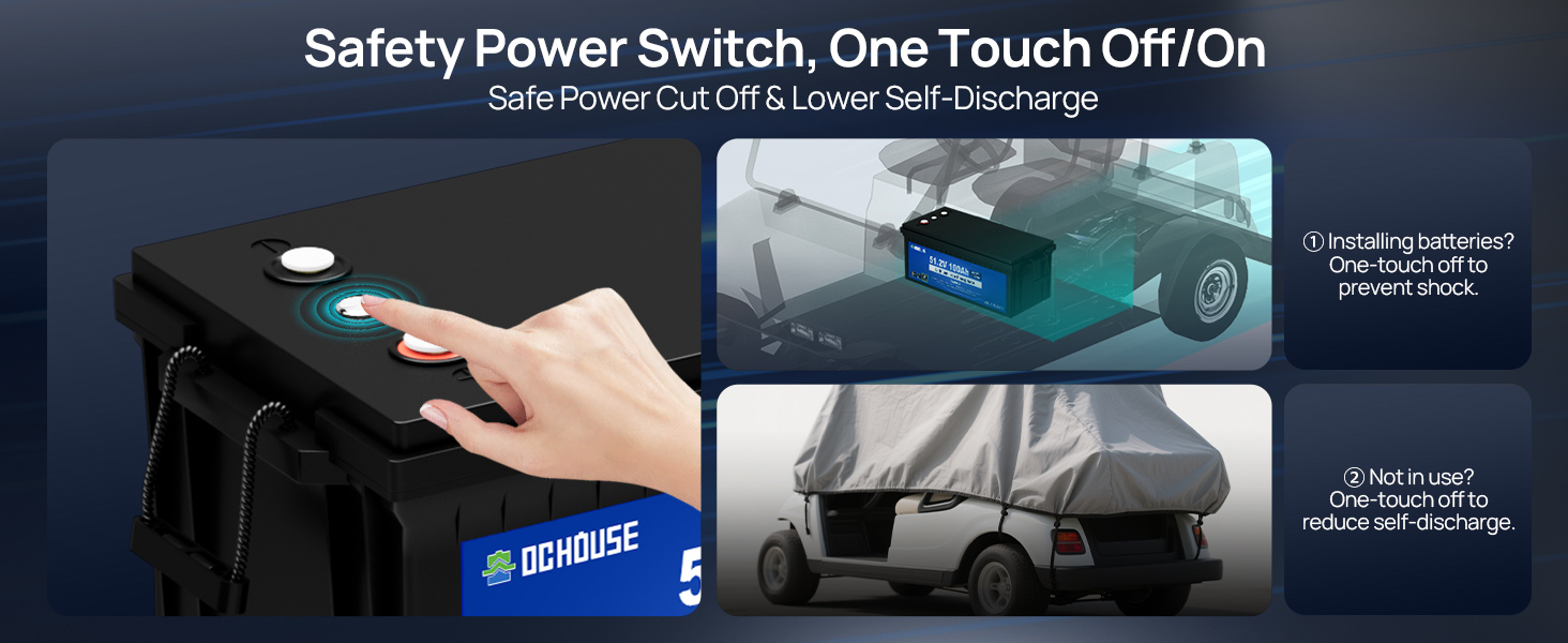DC HOUSE 48V 100Ah lithium iron phosphate battery is built-in with an upgraded 200A intelligent BMS, the peak current can be up to 700A/1 seconds. Strong climbing ability, it can easily cope with a slope of about 20 degrees. Has a capacity of 5.12kWH, a battery life of 40-56 miles, and can easily complete 4-9 rounds of 18-hole tournaments