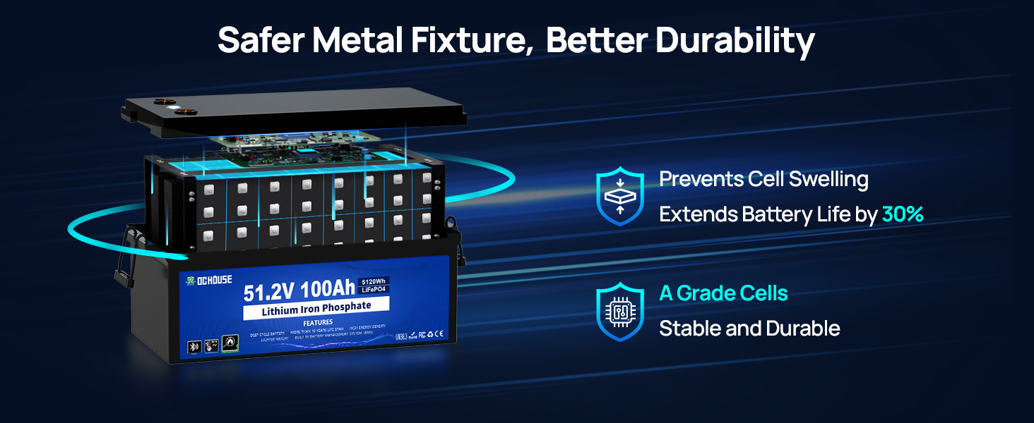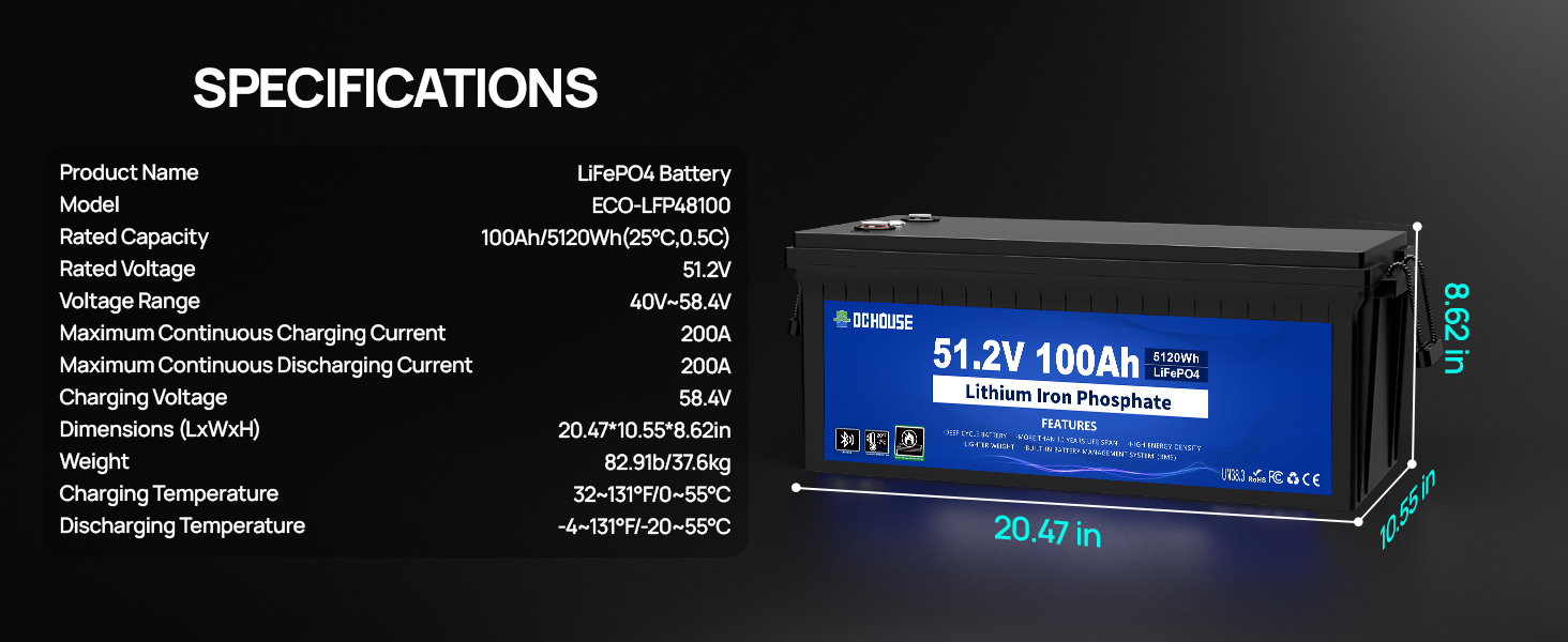 DC HOUSE 48V 100ah lifepo4 battery has upgraded Low Temperature Protection. When the temperature sensor of 100Ah lifepo4 detects that the temperature is below 19.4℉, the BMS will cut off the charging function, cut off the discharge when it is below- 4℉, and automatically recover charging function after the temperature rises to 32℉. Effectively protect the 48V 100Ah battery and extend the battery life
