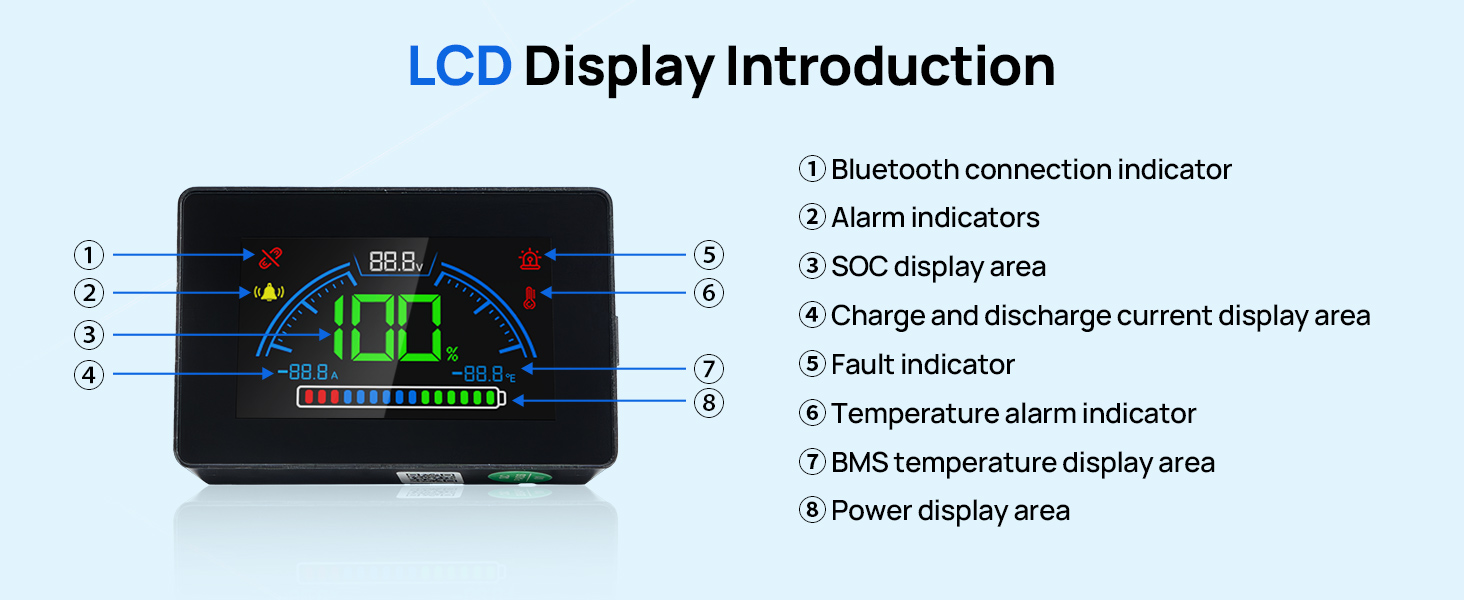 Supports Bluetooth & Screen for seamless battery info monitoring. Wirelessly check capacity & monitor power levels for smarter, easier battery management. An intelligent display specifically designed for battery monitoring, it can more accurately monitor battery percentage, voltage, current, capacity, and more in real-time.