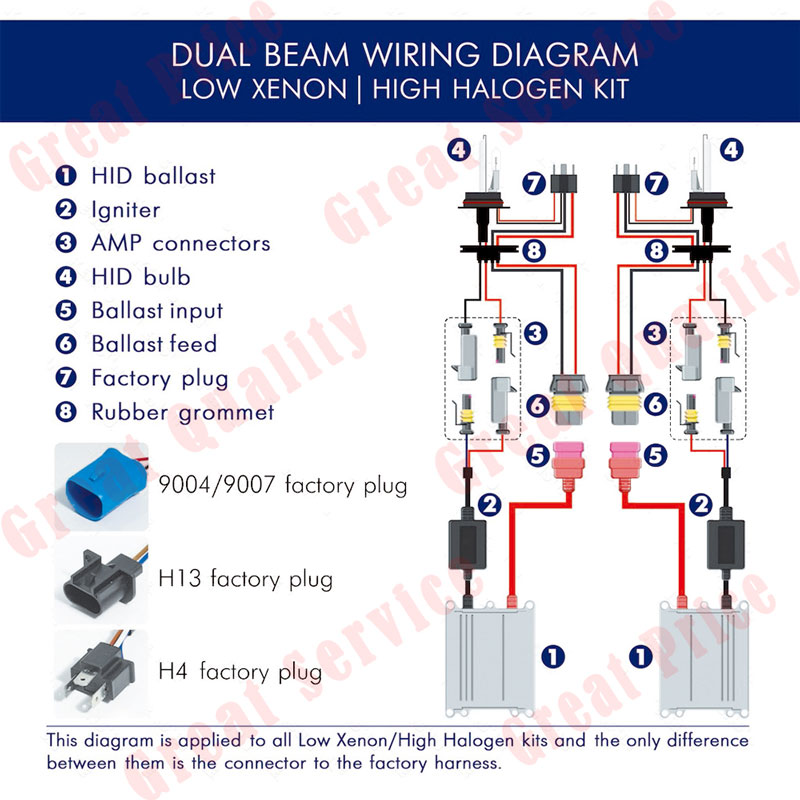 HID Bulbs: Available bulb Single Beam: H1, H7, (High or Low beam depends on what your car model is, No high beam and Low beam at the same time.) Available bulb Dual Beam: H4/9003 (Hi/Lo Beam) Power: 55W Luminouns flux: 3200lm Input voltage: DC 9-32V (fit for universal) Input current: 6A MAX Working Current: 4.2A Working Noise: ≤5DBA Temperature range:-40 degree to +105 degree Warranty: 5 Year warranty Compatibility: Car, motorcycle, electric motor car