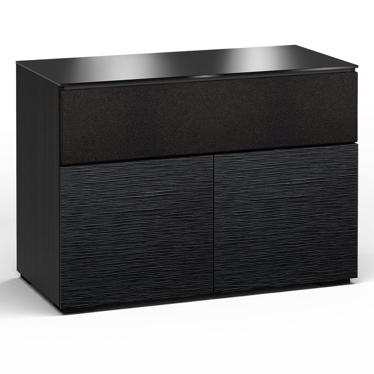 The light look and feel of tall grasses are finely set in a horizontal textured pattern. Black oak with black glass top and black feet work in unison creating the cabinet's hi-tech facade.