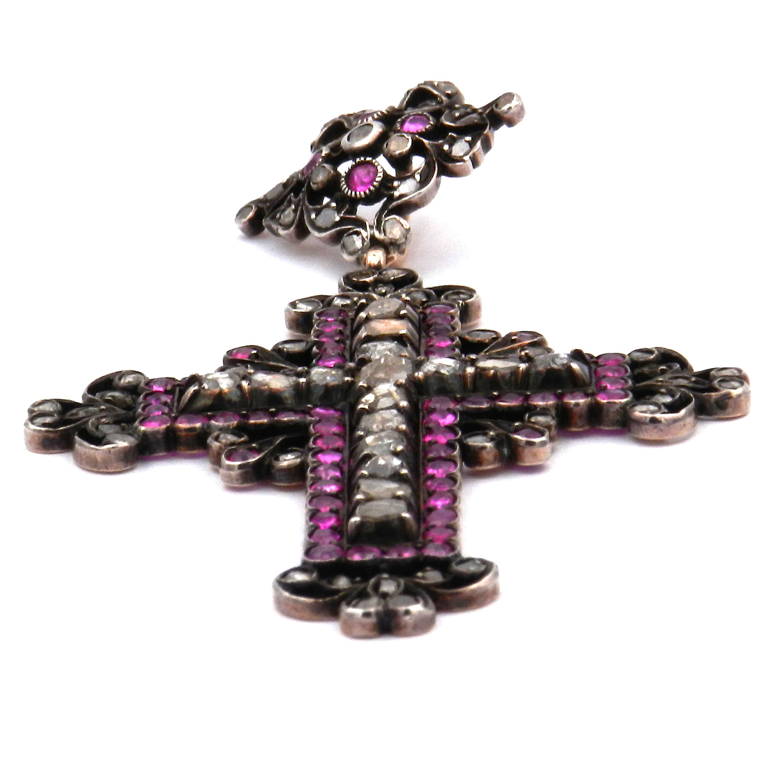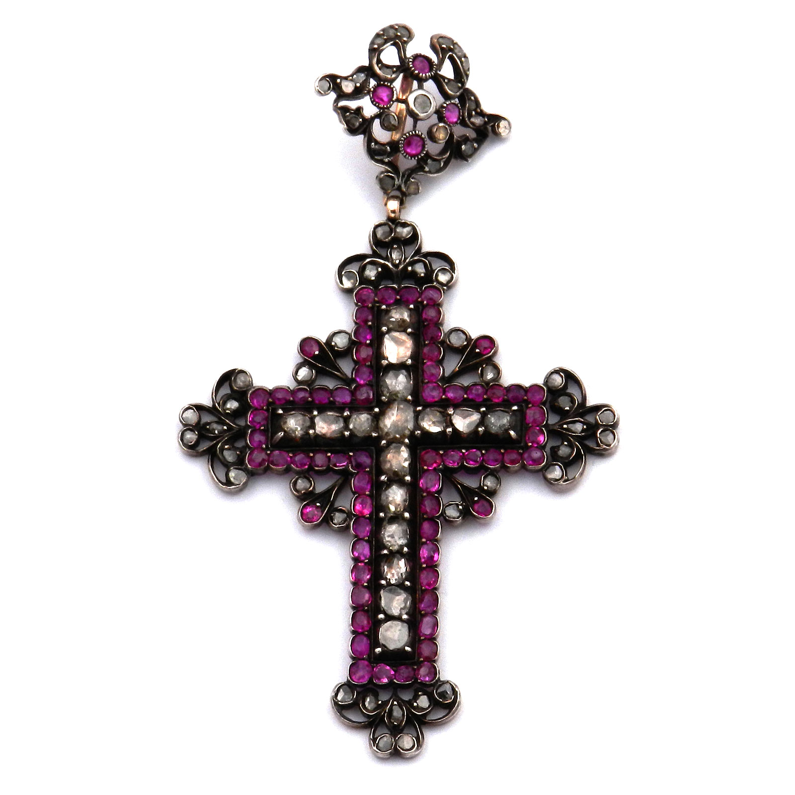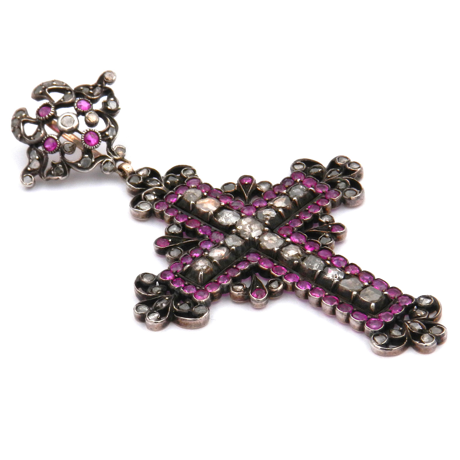 Dieser prächtige Kreuz Anhänger im Stil der Neorenaissance entstand um 1880. Das Kreuz wurde aus oxydiertem Silber und 14-karätigem Gold gearbeitet und mit Rubinen und Diamanten reich verziert. Die Enden der Balken werden von Rocaillemotiven aus Silber geschmückt. Die Mitte ist mit einer Linie aus strahlenden Diamantrosen in geschlossener Fassung besetzt, die Ränder sind von einer Reihe aus leuchtend roten Rubinen umfasst. Die blütenförmige Anhängeröse ist mit üppigem Rollwerk, Rubinen und Diamantrosen reich dekoriert. Das Kreuz hat eine Länge von 8,7 cm und ist 5,6 cm breit.