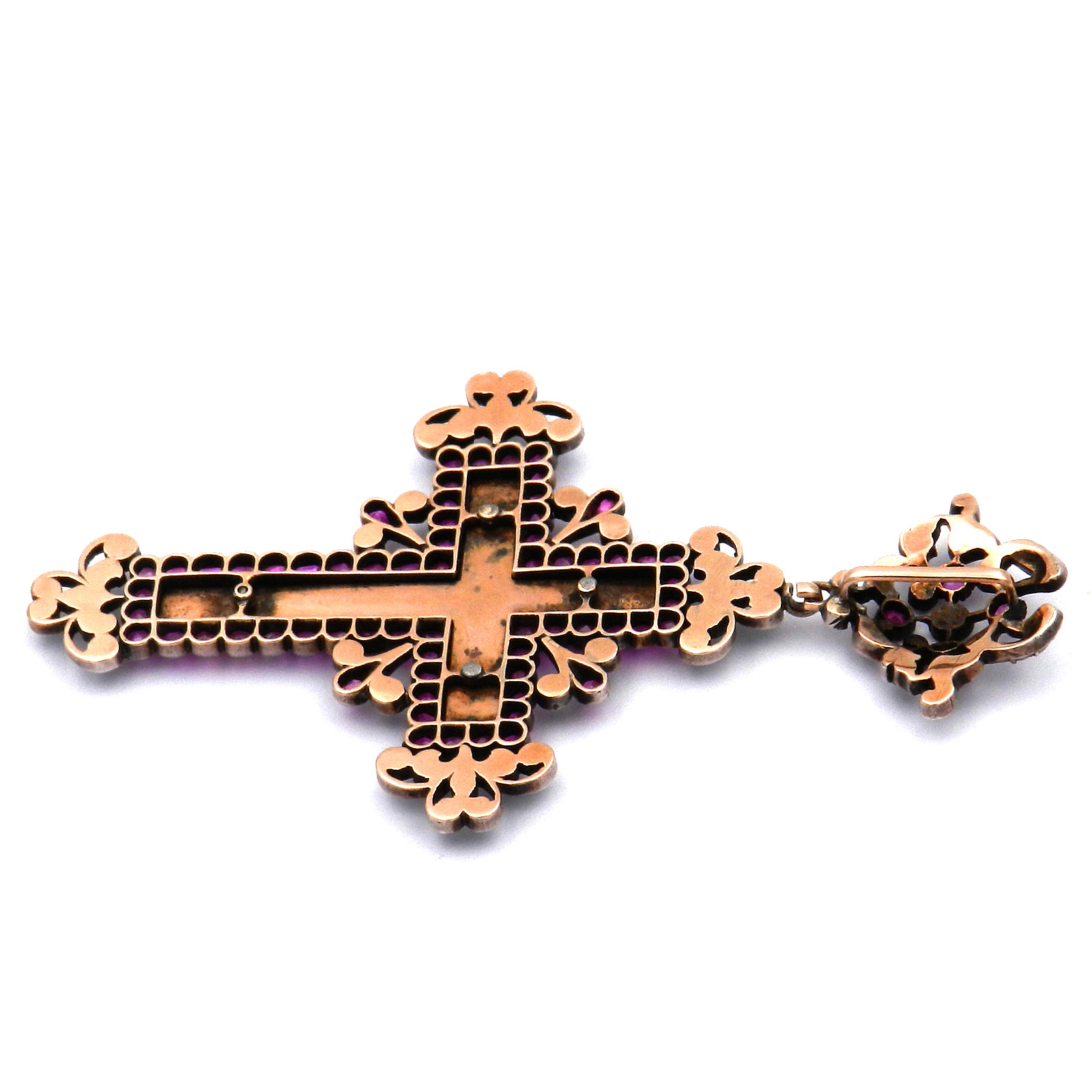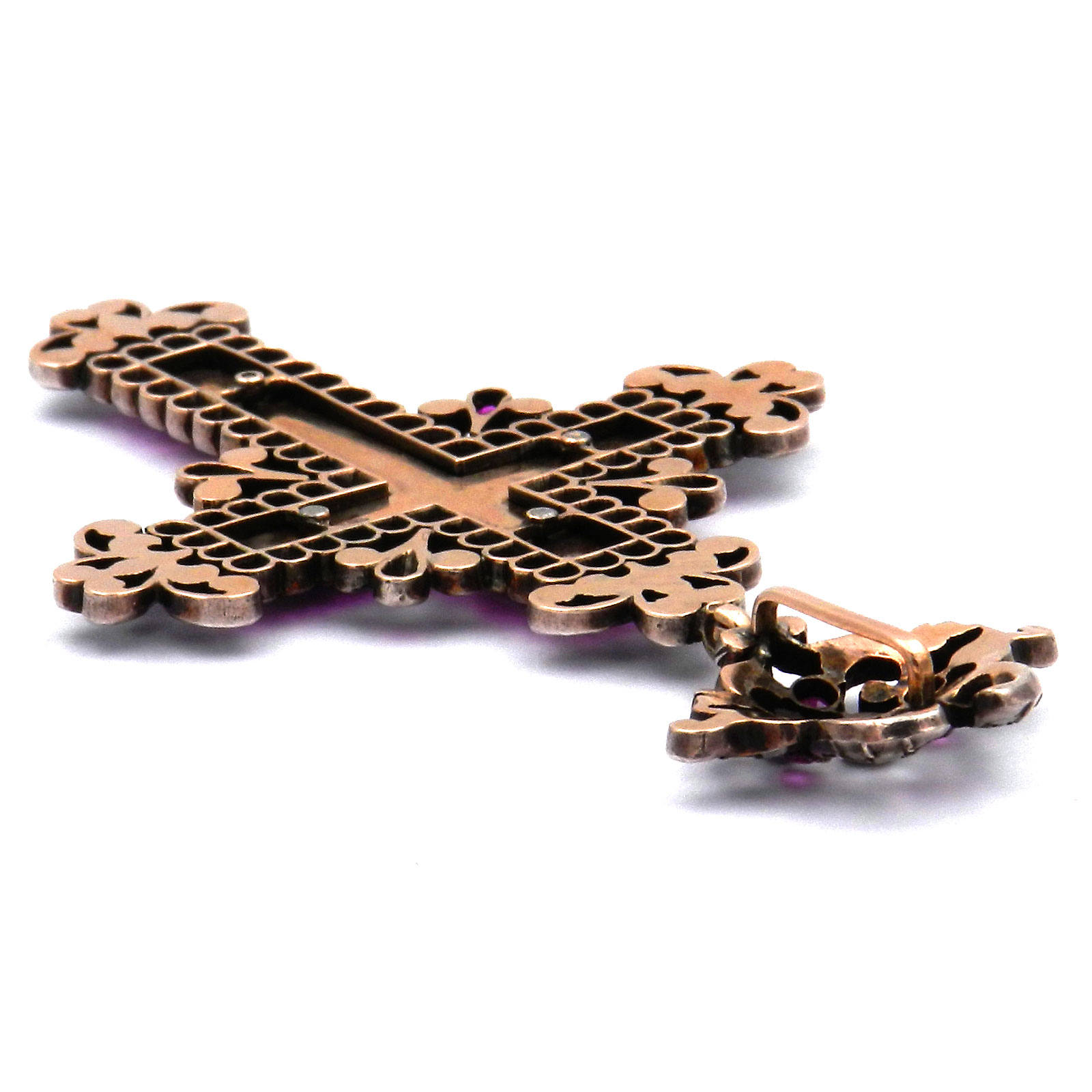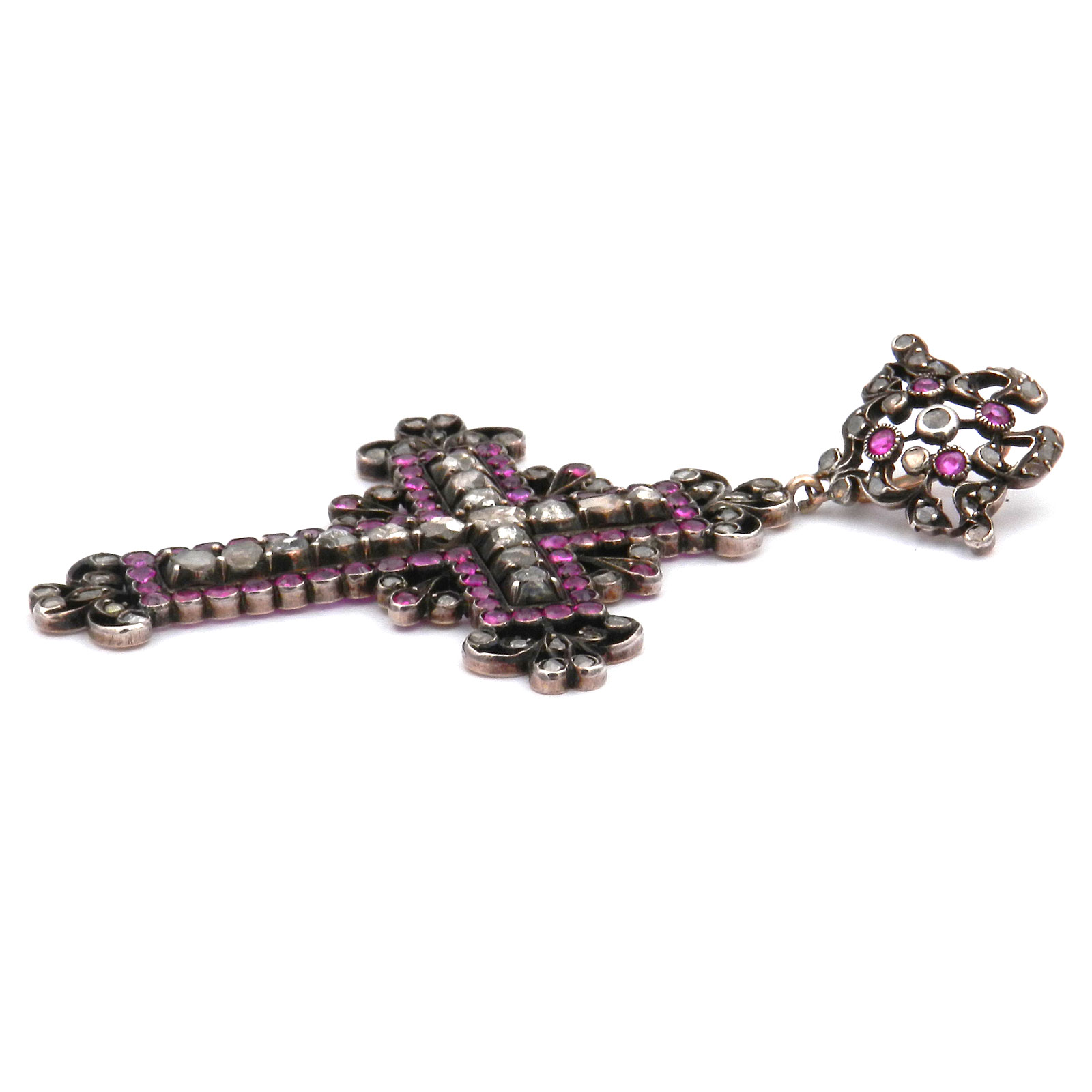 Dieser prächtige Kreuz Anhänger im Stil der Neorenaissance entstand um 1880. Das Kreuz wurde aus oxydiertem Silber und 14-karätigem Gold gearbeitet und mit Rubinen und Diamanten reich verziert. Die Enden der Balken werden von Rocaillemotiven aus Silber geschmückt. Die Mitte ist mit einer Linie aus strahlenden Diamantrosen in geschlossener Fassung besetzt, die Ränder sind von einer Reihe aus leuchtend roten Rubinen umfasst. Die blütenförmige Anhängeröse ist mit üppigem Rollwerk, Rubinen und Diamantrosen reich dekoriert. Das Kreuz hat eine Länge von 8,7 cm und ist 5,6 cm breit.