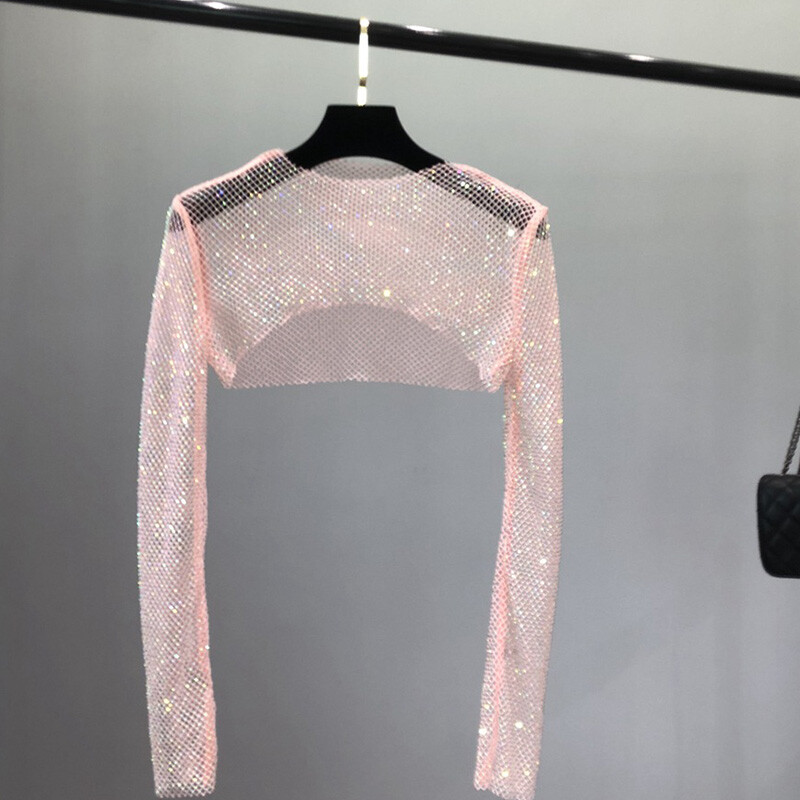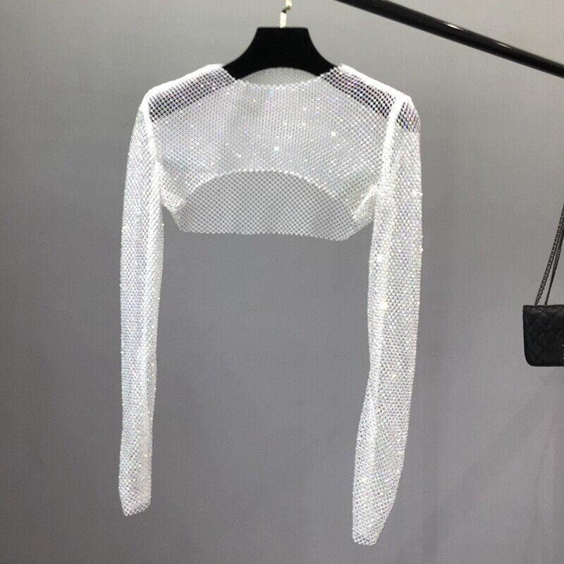 Item: Long Sleeve Women Mesh Crop Top with Rhinestone Fishnet Shawl Shirt Cover Ups