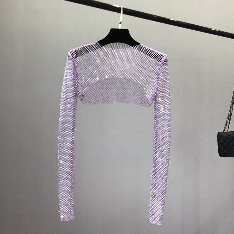 Item: Long Sleeve Women Mesh Crop Top with Rhinestone Fishnet Shawl Shirt Cover Ups * Condition: 100% Brand New * Color:Purple,Pink,Khaki,Black ,White * Size:Asian * Package:1pc top (without any accessories )
