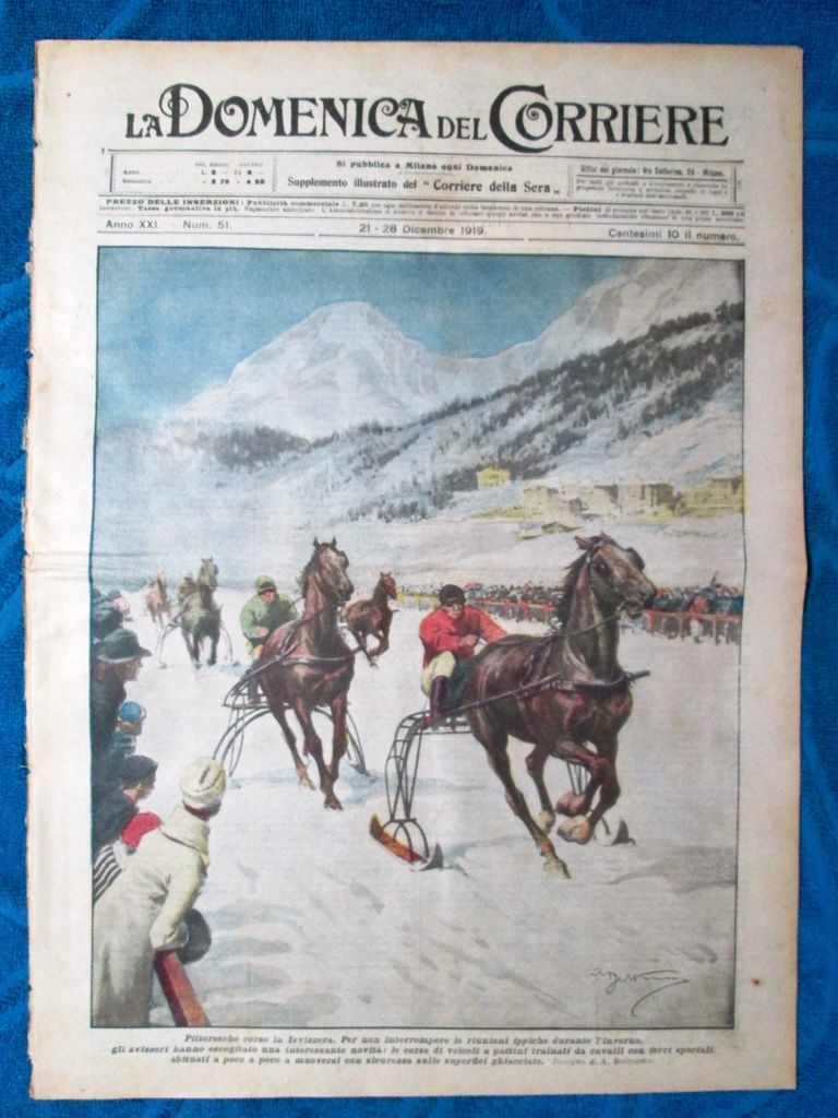 Pittoresche corse in Svizzera. Per non interrompere le riunioni ippiche durante l'inverno, gli svizzeri hanno escogitato una interessante novità: le corse di veicoli a pattini trainati da cavalli con ferri speciali, abituati a poco a poco a muoversi con sicurezza sulle superfici ghiacciate