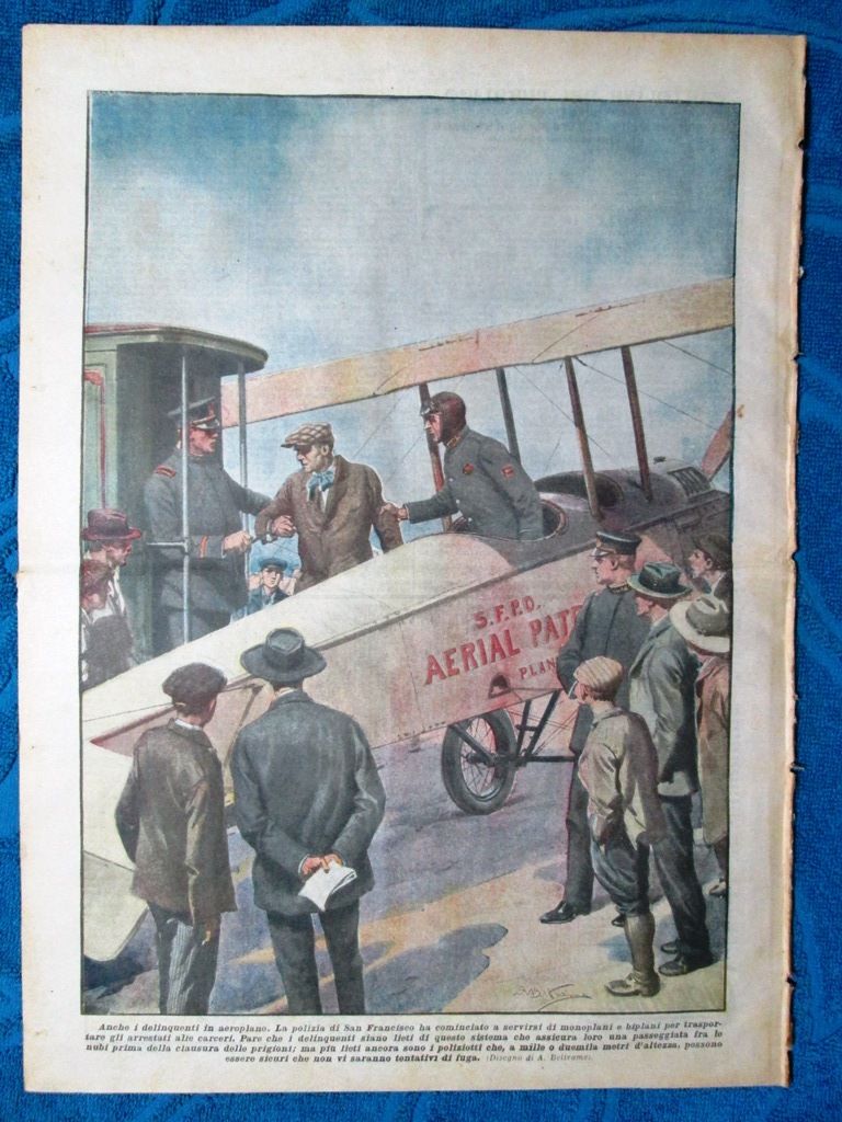 Anche i delinquenti in aeroplano. La polizia di San Francisco ha cominciato a servirsi di monoplani e biplani per trasportare gli arrestati alle carceri. Pare che i delinquenti siano lieti di questo sistema che assicura loro una passeggiata fra le nubi prima della clausura delle prigioni; ma più lieti ancora sono i poliziotti che, a mille o duemila metri d'altezza, possono essere sicuri che non vi saranno tentativi di fuga