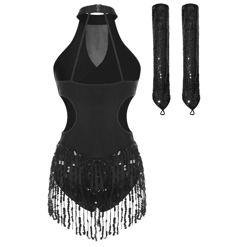 Cutout-Design auf beiden Seiten des Taillenumfang, verziert mit funkelnden Pailletten und Quasten, machen Sie noch auffälliger.