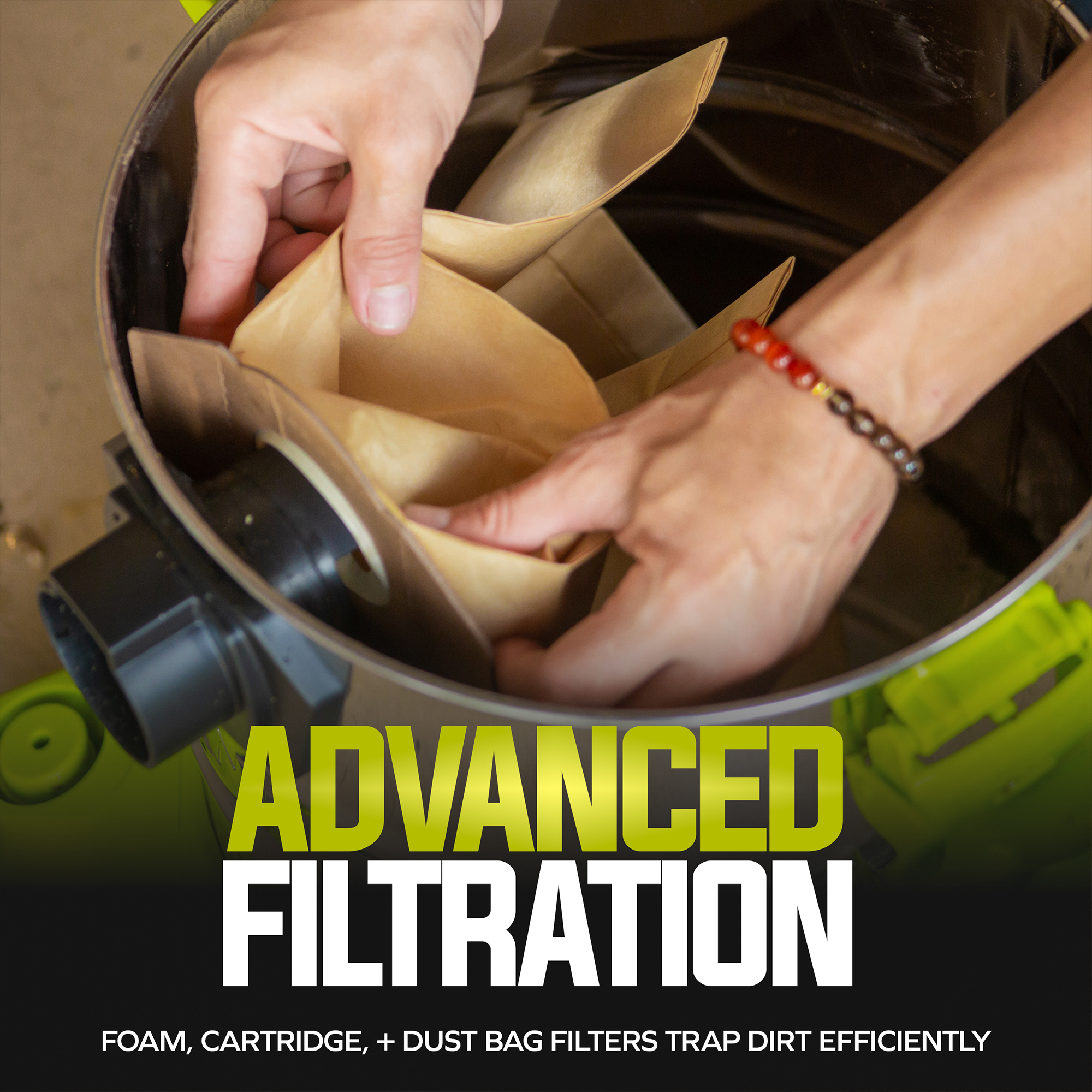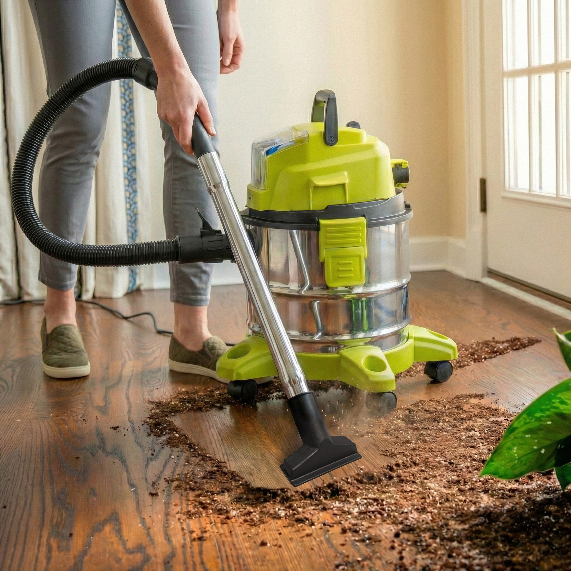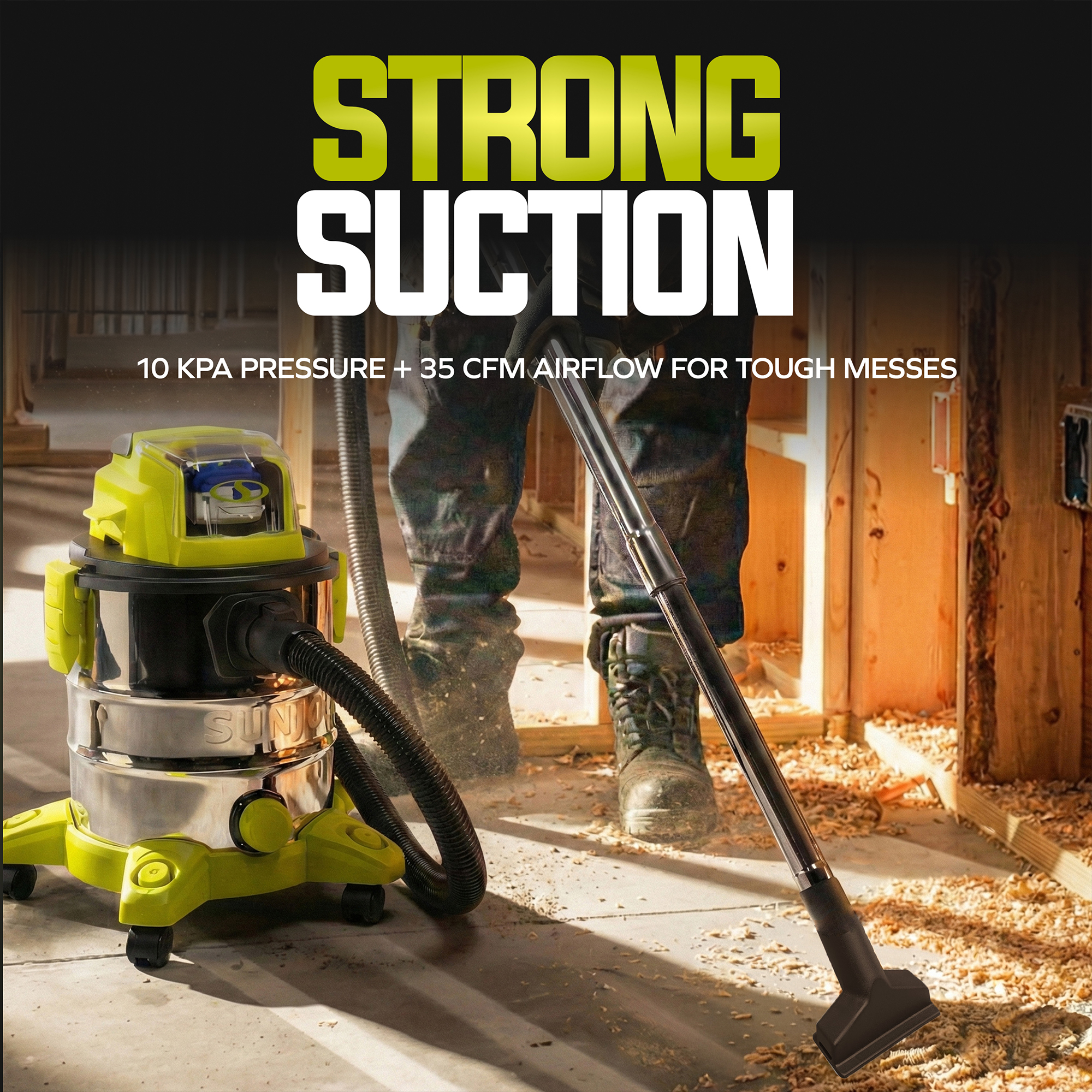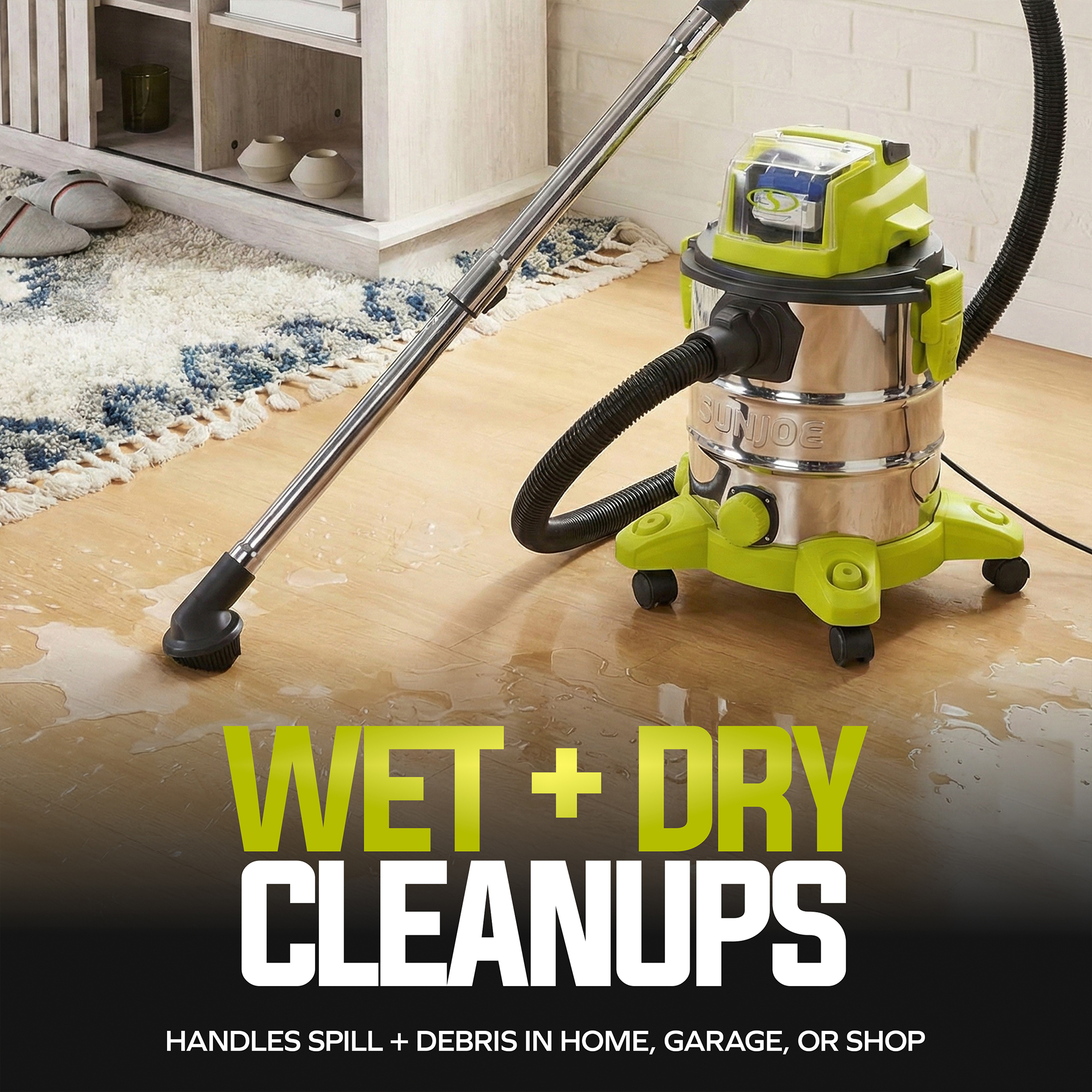 Cleaning versatility comes standard with a complete accessory kit: a carpet and floor brush, all-purpose nozzle, crevice nozzle, and extension tubes, so you can go from carpets to corners to car interiors without switching tools. Whether it's sawdust in the shop, spills in the kitchen, or dirt tracked into your car, Sun Joe's got you covered.