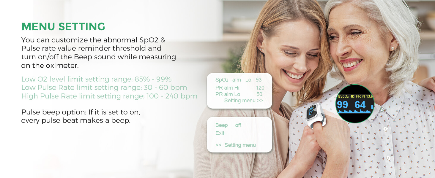 If your 02 level or PR value exceeds the preset limit, this finger pulse oximeter will remind you with a buzzer and the corresponding reading will flash on the screen.