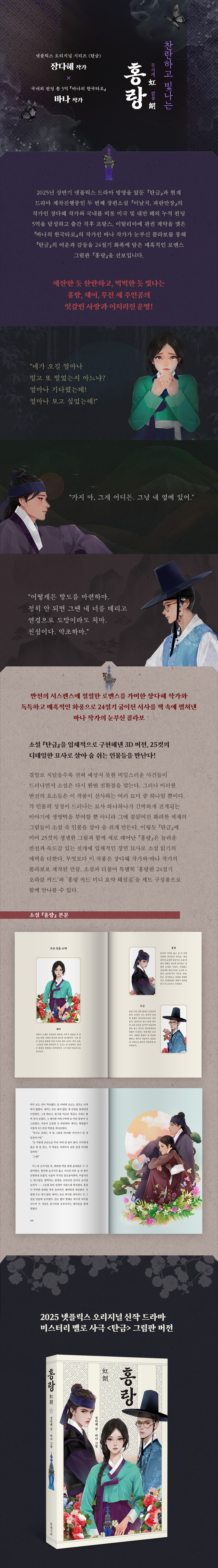 2021년 『탄금』 출간 직후 뜨거운 반응으로 이미 드라마와 웹툰 제작을 비롯해 해외 판권 계약까지 마친 데 이어 넷플릭스 시리즈 [탄금] 방영에 앞서 의미 있는 감상 포인트를 제공하는 특별판을 출간하게 되었다. 하지만 단순히 스토리 전개상의 새로운 시도에 그치는 것이 아니라 『홍랑』이 특별한 이유는 따로 있다. 『탄금』의 그림판 버전으로 출간되는 만큼 이 작품은 다름 아닌 한국의 미美로 재해석해 그린 타로 카드 펀딩으로 국내외 누적 5억을 달성하고 78장의 타로 카드와 함께 『바나의 한국 타로』를 출간한 바나 작가와 협업으로 이루어졌다는 것이다. 품격 있는 고어와 아름다운 우리말로 빚어진 빼어난 스토리, 거기에 24절기의 다채로운 그림이 더해져 소설은 다시금 숨을 불어넣은 또 다른 한 편의 드라마로 재탄생했다. 더불어 장다혜 작가는 폭넓은 독자층에 보다 더 쉽게 다가가고자 『홍랑』은 기존의 서스펜스보다 홍랑과 재이 그리고 무진의 이야기에 집중했다.