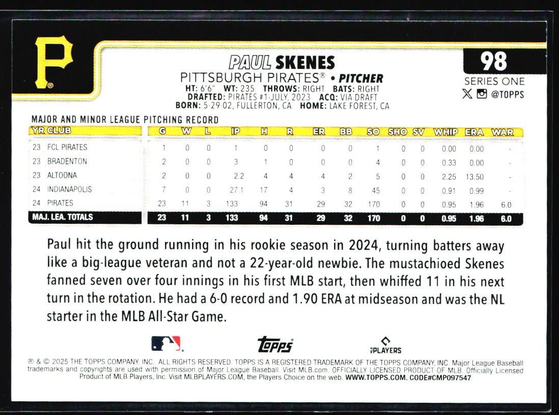 2025 Topps Paul Skenes Pittsburgh Pirates #98