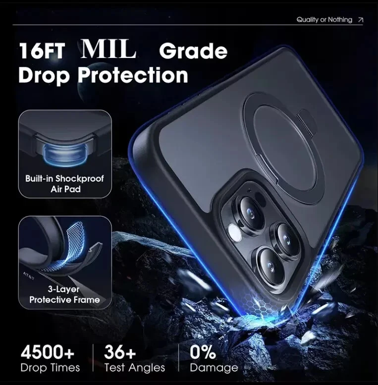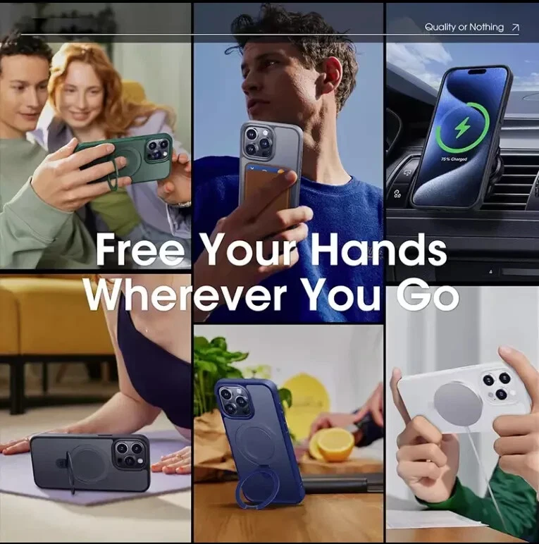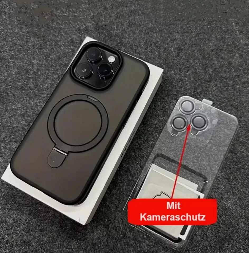 Die integrierte Magnet-Ringhalterung bietet eine praktische 2-in-1-Funktion: Sie dient als stabiler Standfuß zum Video-Schauen oder Arbeiten und ermöglicht gleichzeitig kompatibles kabelloses Laden über MagSafe. Das edle Gehäuse schützt zuverlässig vor Stürzen, Kratzern und Stößen, während der erhöhte Kamerarand Ihre Linsen rundum absichert.