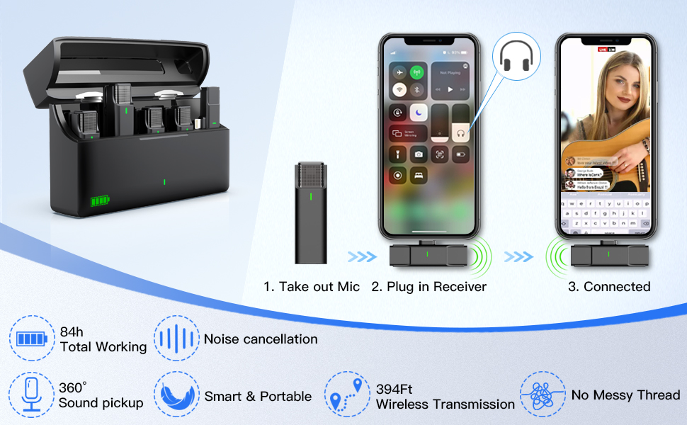 【Stable 396ft Wireless Range & Uninterrupted Playback Feature】Enjoy reliable wireless freedom with a robust signal range of up to 396 feet (approx. 120m) in open areas. Move confidently during shoots. (Note: If your phone plays recorded videos without sound, please disconnect the receiver or use headphones to watch.)