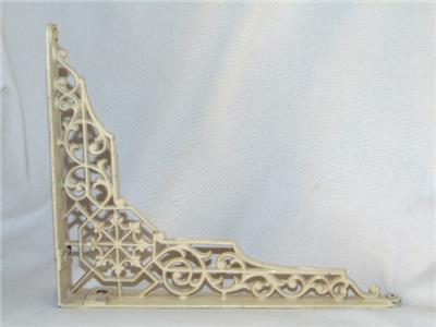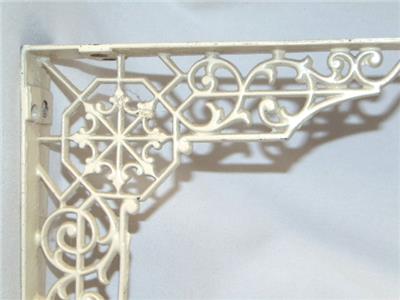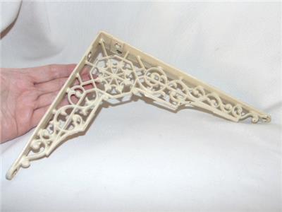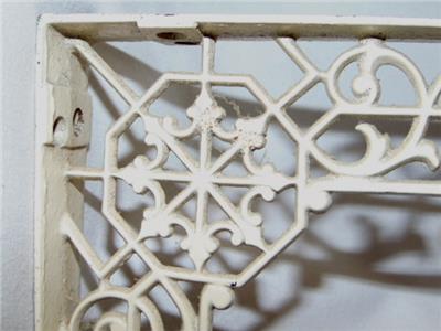 Wonderful antique cast iron shelf bracket measuring 10" by 8" in size. Featuring an Aesthetic cobweb and scrollwork design, it bears the old cream paint and is pierced on both the ends and center for mounting. I used this to support the middle of a long kitchen shelf when it started to sag from the weight of all my cookbooks.