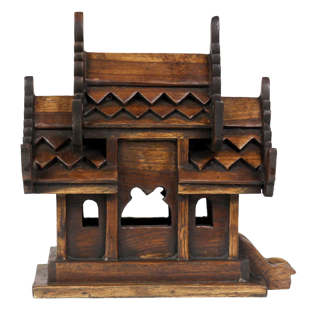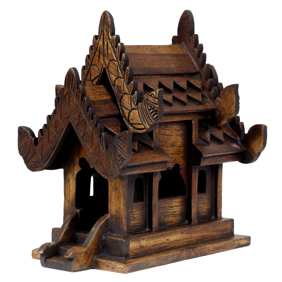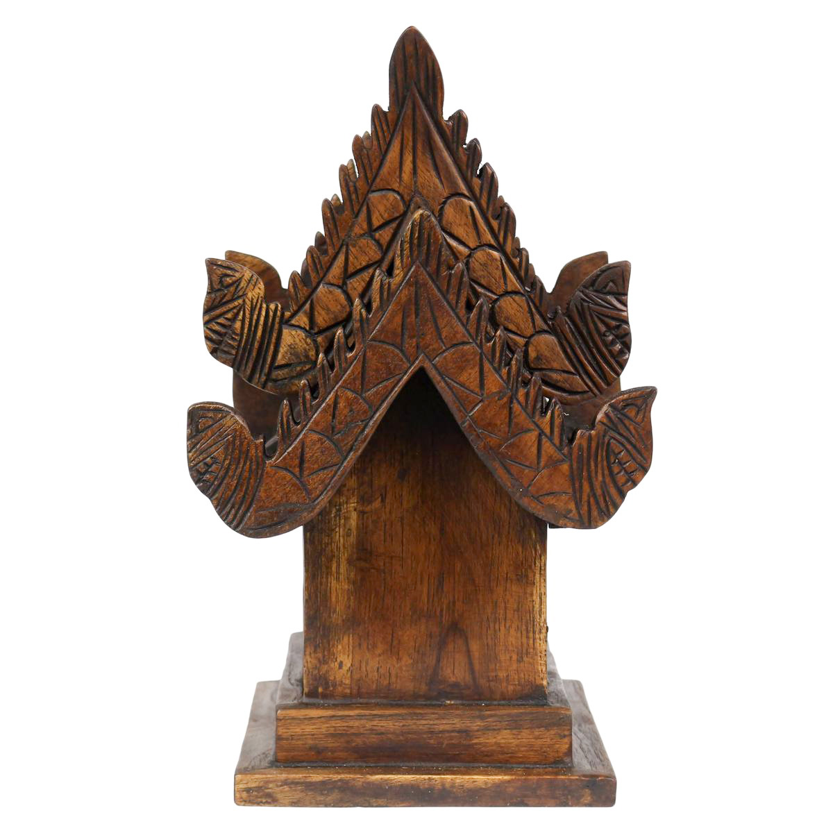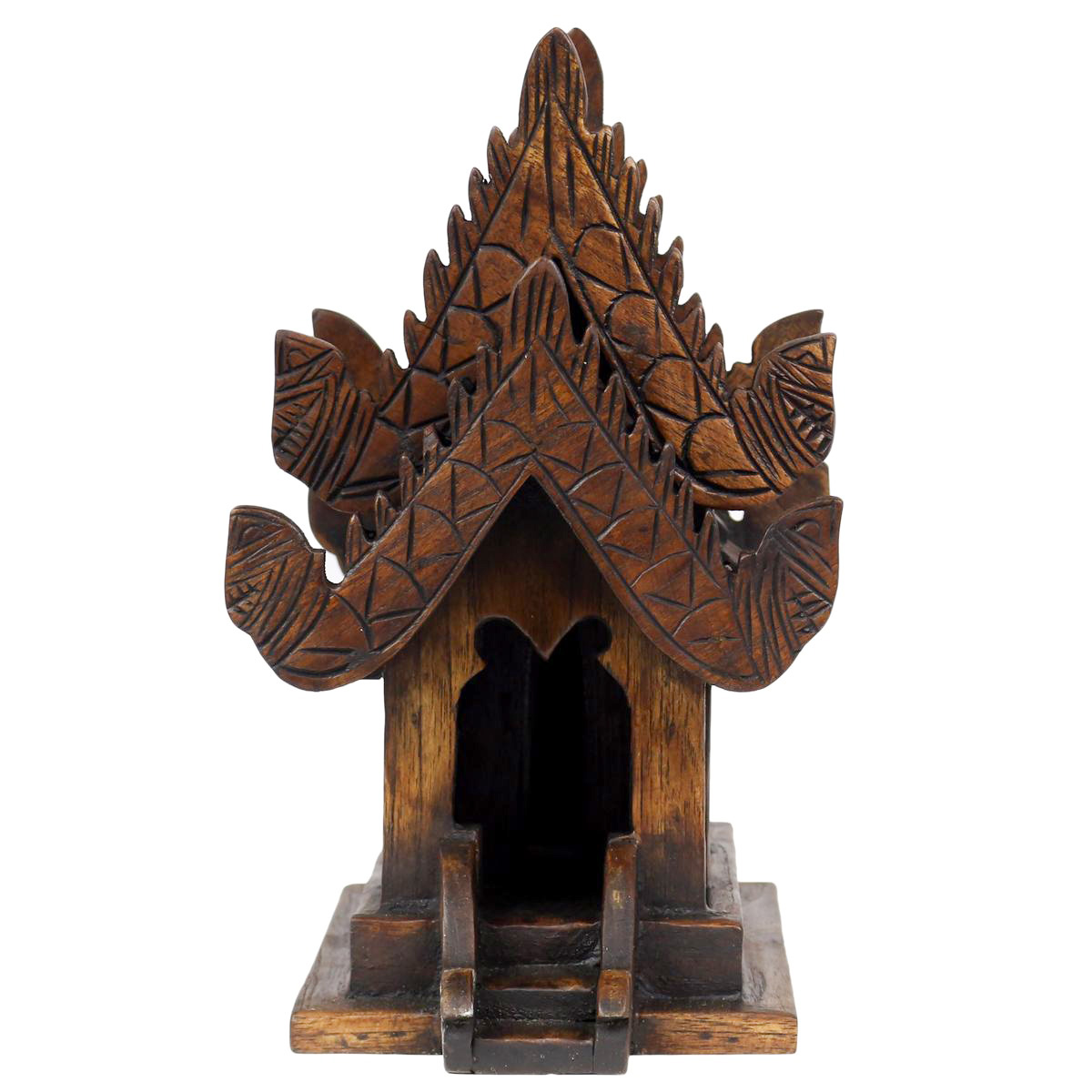 Dieses kunstvoll geschnitzte Geisterhaus aus Thailand (San Phra Phum) wird traditionell errichtet, um Naturgeistern ein neues Zuhause zu geben – besonders bei Neubauten oder Umzügen. Es steht für Schutz, Harmonie und Glück.