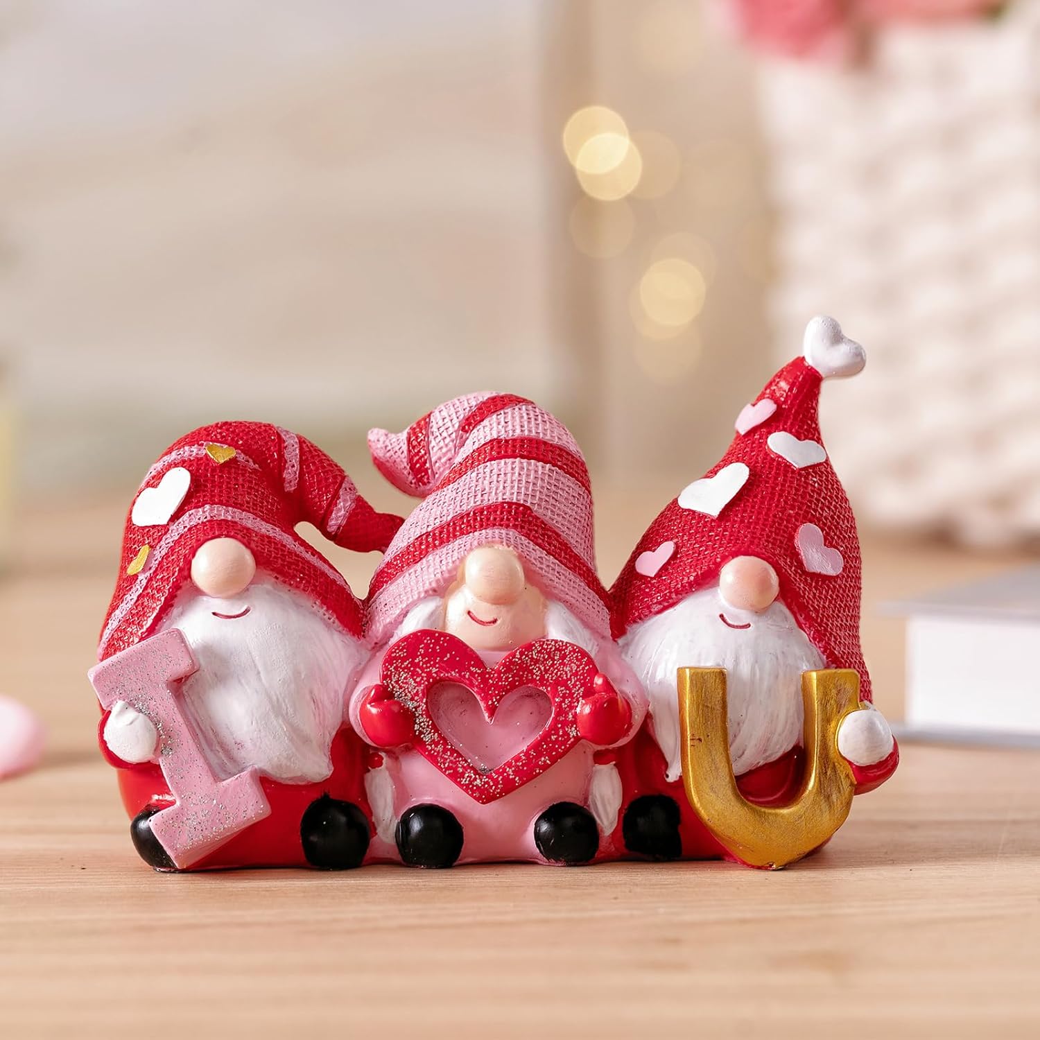 Valentine Gnomes Decorations for Home: Experience a romantic scene with these lovely gnome figurines, featuring vibrant red and pink hues that make them an beautifull addition to your Valentine's Day celebrations. Three gnomes holding letters expressing "I Love You" create a warm and romantic atmosphere, spreading love and joy throughout your home.