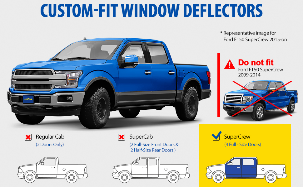 Attention! Vent Deflector FITS ONLY for Ford F150 2015-2025 SuperCrew, Ford F150 Raptor 2017-2025 SuperCrew, Ford F250 Super Duty 2017-2025 Crew Cab, Ford F350 Super Duty 2017-2025 Crew Cab, Ford F450 Super Duty 2017-2025 Crew Cab, Ford F550 Super Duty 2017-2025 Crew Cab.