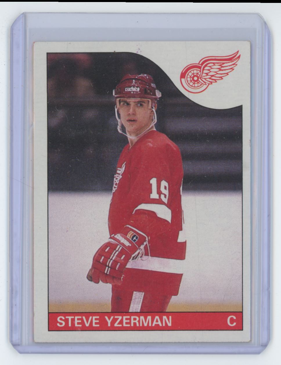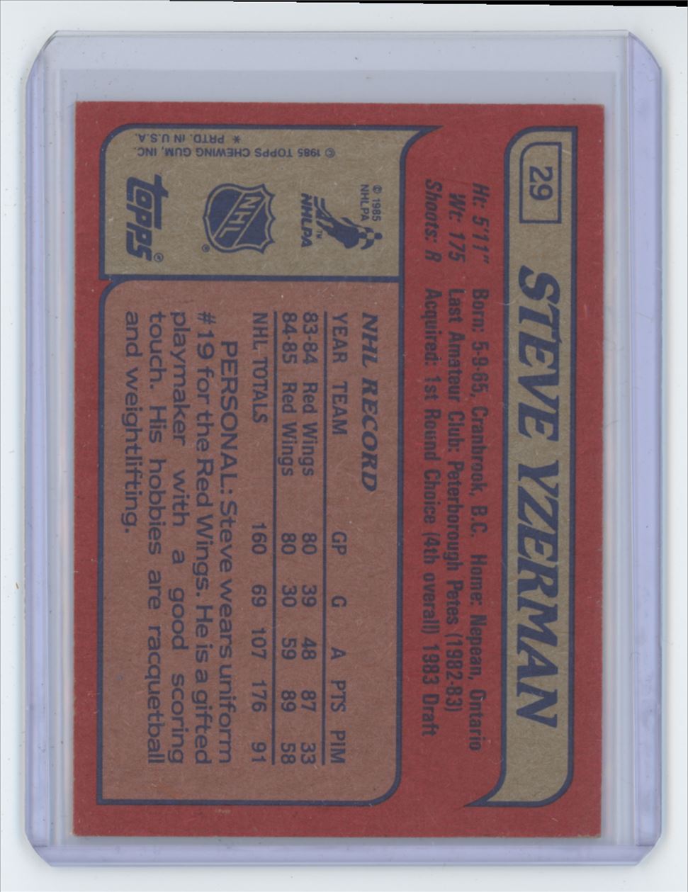 | Description: | Steve Yzerman | | Category: | Hockey | | Year: | 1985 | | Product: | Topps | | Team: | Hockey Cards | | Card Number: | 29 | | Dimensions: | 4" x 3" |