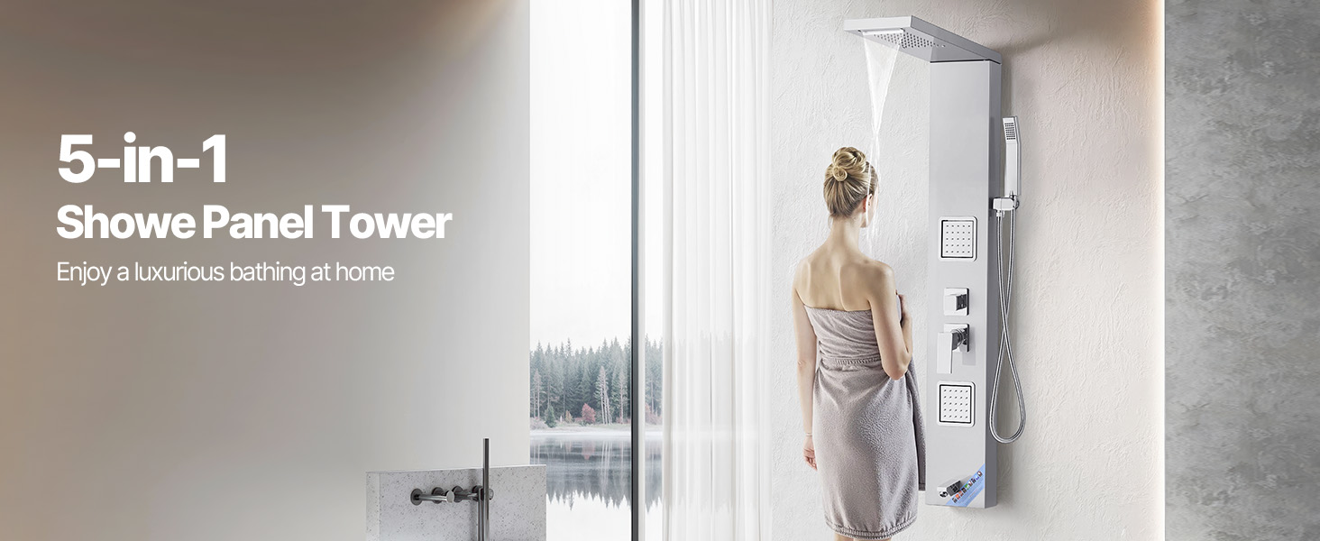 - Sistema doccia 5 in 1: questo sistema a torre con pannello doccia è dotato di pioggia, cascata, due grandi getti massaggianti per tutto il corpo, un beccuccio per vasca e una doccetta. Soddisfa diverse esigenze: dal risciacquo veloce al rilassamento profondo