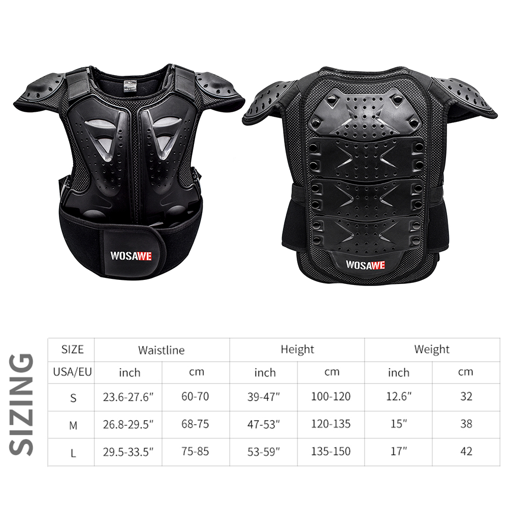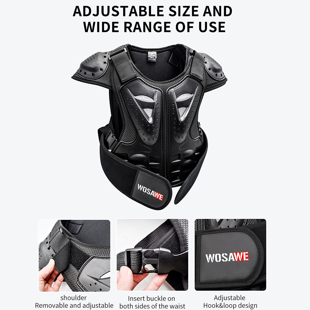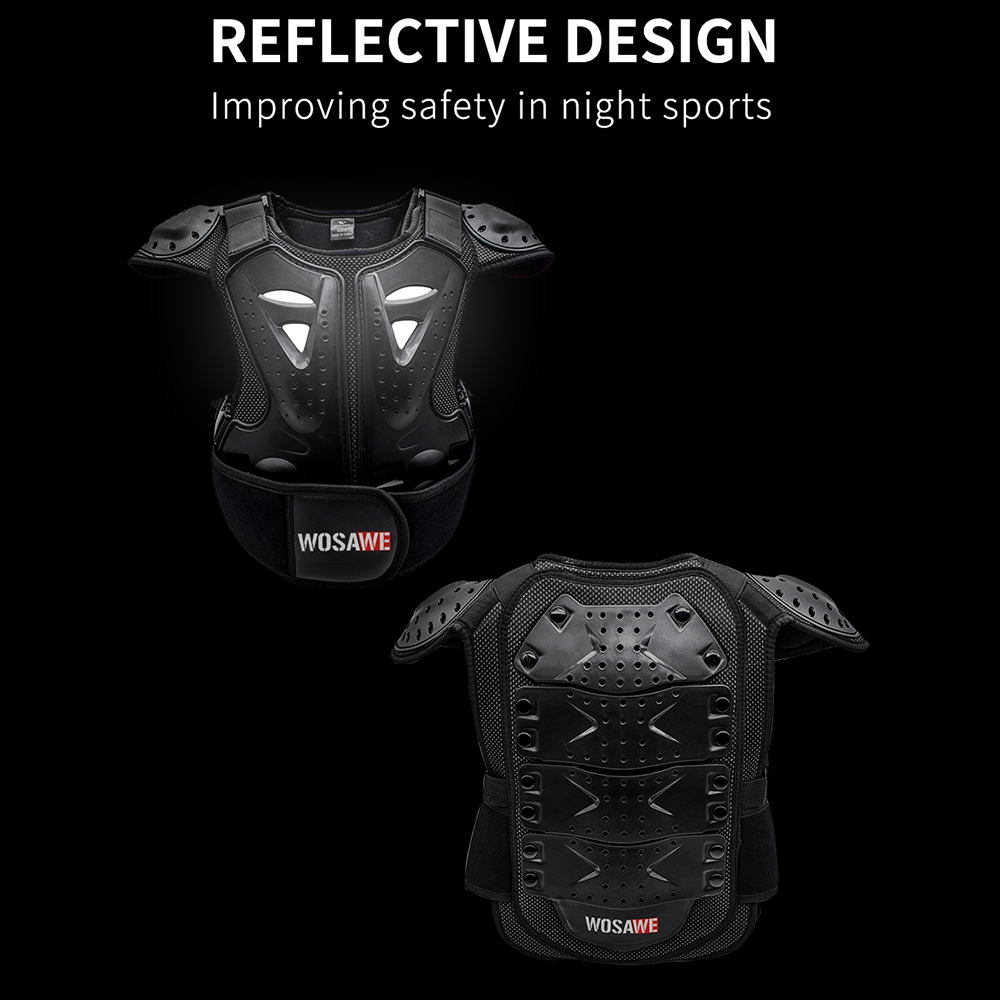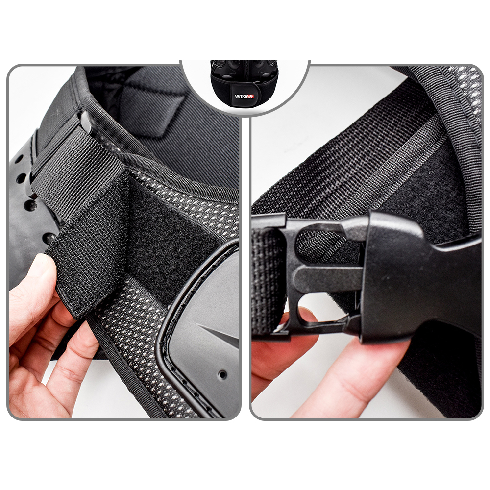 Hip Protective Shorts: S (waist 64-72cm, height 155-160cm) M (waist 72-80cm, height 160-165cm) L (waist 80-88cm, height 165-170cm) Polyester fabric with high elasticity Elastic waistband Mesh crotch stitching, good breathability Hook&Loop waist and crotch Crotch left and right sides and back waist for hidden EVA foam cotton Both sides of the left and right legs, the lower back of the thighs and hips for visible EVA foam Cloth label LOGO, non-reflective Available for children, teenagers and adults Suitable for bicycle, motorcycle, skateboard, roller skating, skiing, mountain biking, ice skating and other sports Chest Armor: S (height 100-120cm, waist 60-70cm, three pieces of armor at back) M (height 120-135cm, waist 68-75cm, four pieces of armor at back) L (height 135-150cm, waist 75-85cm, five pieces of armor at back) Fine wrap around neckline PE shell protection on shoulders, front chest and back, multiple small holes in the shell with built-in reflective fabric Shoulder with Hook&Loop for adjustable elasticity Detachable front and back armor, controlled by double Hook&Loop at shoulders and quick release buckle at waist Armor protection by EVA filling, multiple holes for breathability Waist quick release buckle connected with band for adjustable elasticity, the buckle press to pull out Sticky surface waist protection design to adjust the waist elasticity WOSAWE print logo at the waist protector and back waist Fit for children and teenagers Suitable for motorbike, cycling, roller, skateboarding, skiing, skating, etc