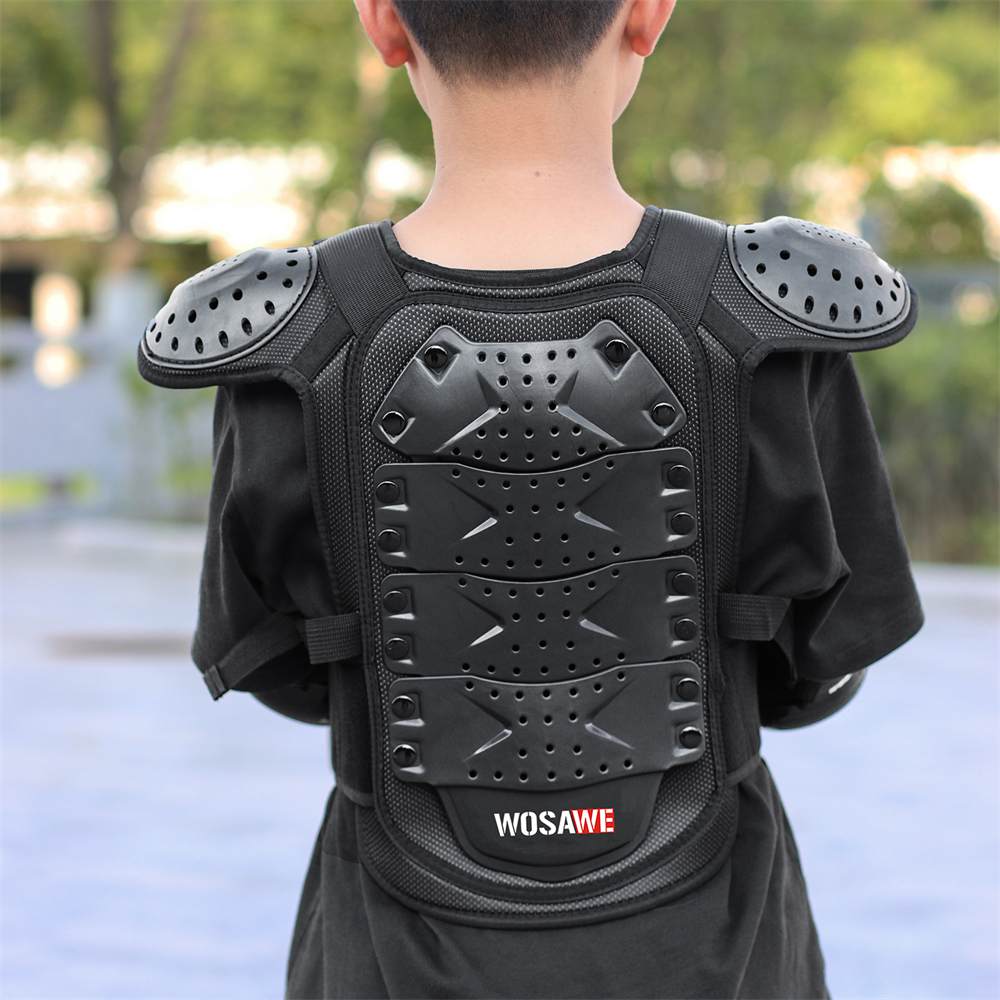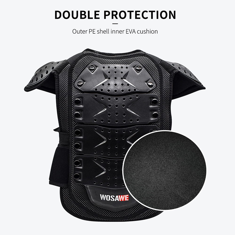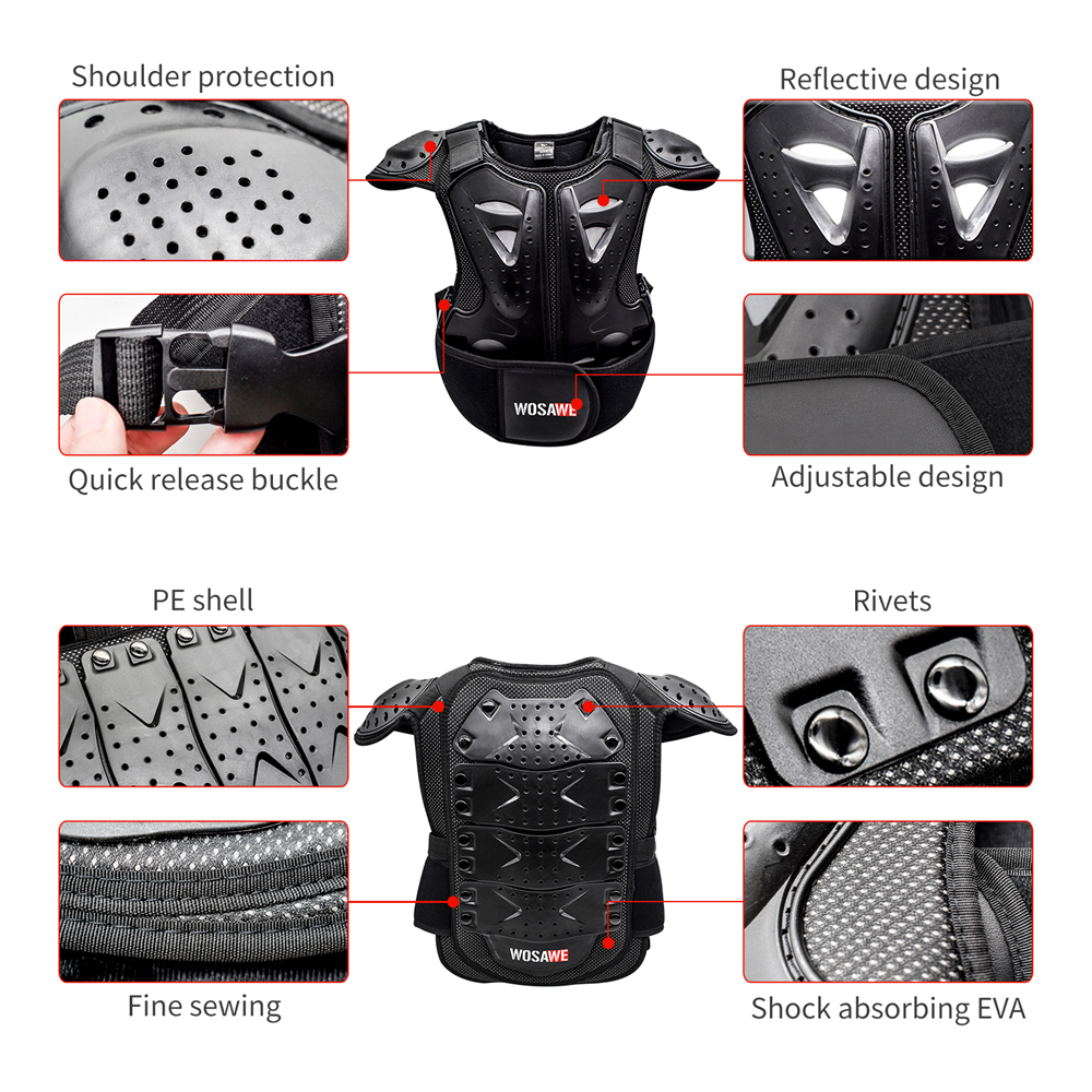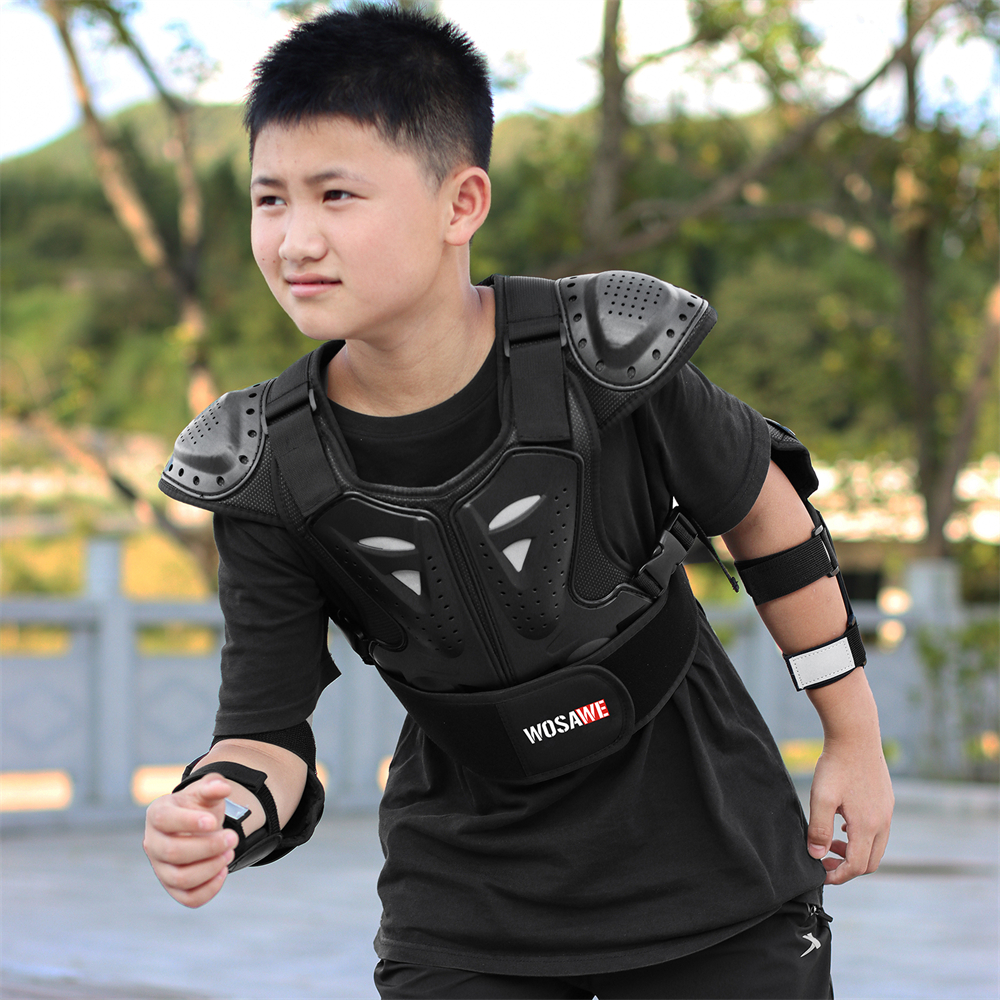 Hip Protective Shorts: S (waist 64-72cm, height 155-160cm) M (waist 72-80cm, height 160-165cm) L (waist 80-88cm, height 165-170cm) Polyester fabric with high elasticity Elastic waistband Mesh crotch stitching, good breathability Hook&Loop waist and crotch Crotch left and right sides and back waist for hidden EVA foam cotton Both sides of the left and right legs, the lower back of the thighs and hips for visible EVA foam Cloth label LOGO, non-reflective Available for children, teenagers and adults Suitable for bicycle, motorcycle, skateboard, roller skating, skiing, mountain biking, ice skating and other sports Chest Armor: S (height 100-120cm, waist 60-70cm, three pieces of armor at back) M (height 120-135cm, waist 68-75cm, four pieces of armor at back) L (height 135-150cm, waist 75-85cm, five pieces of armor at back) Fine wrap around neckline PE shell protection on shoulders, front chest and back, multiple small holes in the shell with built-in reflective fabric Shoulder with Hook&Loop for adjustable elasticity Detachable front and back armor, controlled by double Hook&Loop at shoulders and quick release buckle at waist Armor protection by EVA filling, multiple holes for breathability Waist quick release buckle connected with band for adjustable elasticity, the buckle press to pull out Sticky surface waist protection design to adjust the waist elasticity WOSAWE print logo at the waist protector and back waist Fit for children and teenagers Suitable for motorbike, cycling, roller, skateboarding, skiing, skating, etc
