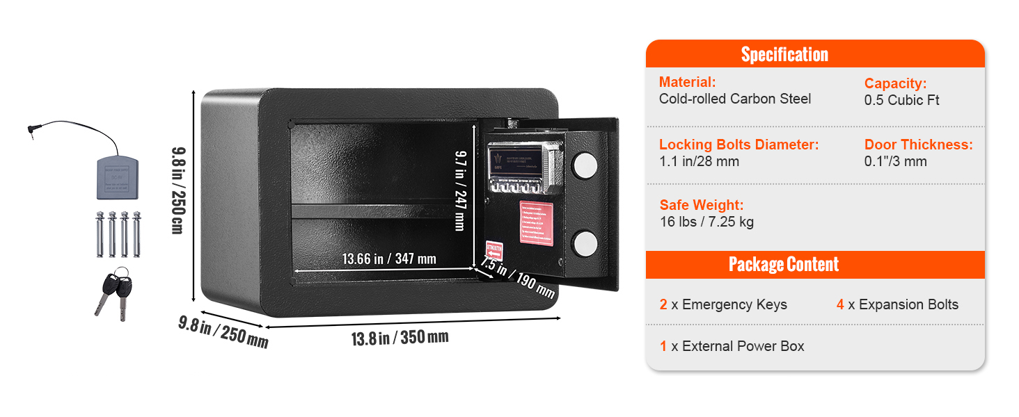 Der Safe ist aus robustem legiertem Stahl gefertigt und gewährleistet so seine Widerstandsfähigkeit gegen potenzielle Einbruchsversuche. Mit einer Dicke von 1,5 mm bietet es physischen Schutz vor gewaltsamem Eindringen.